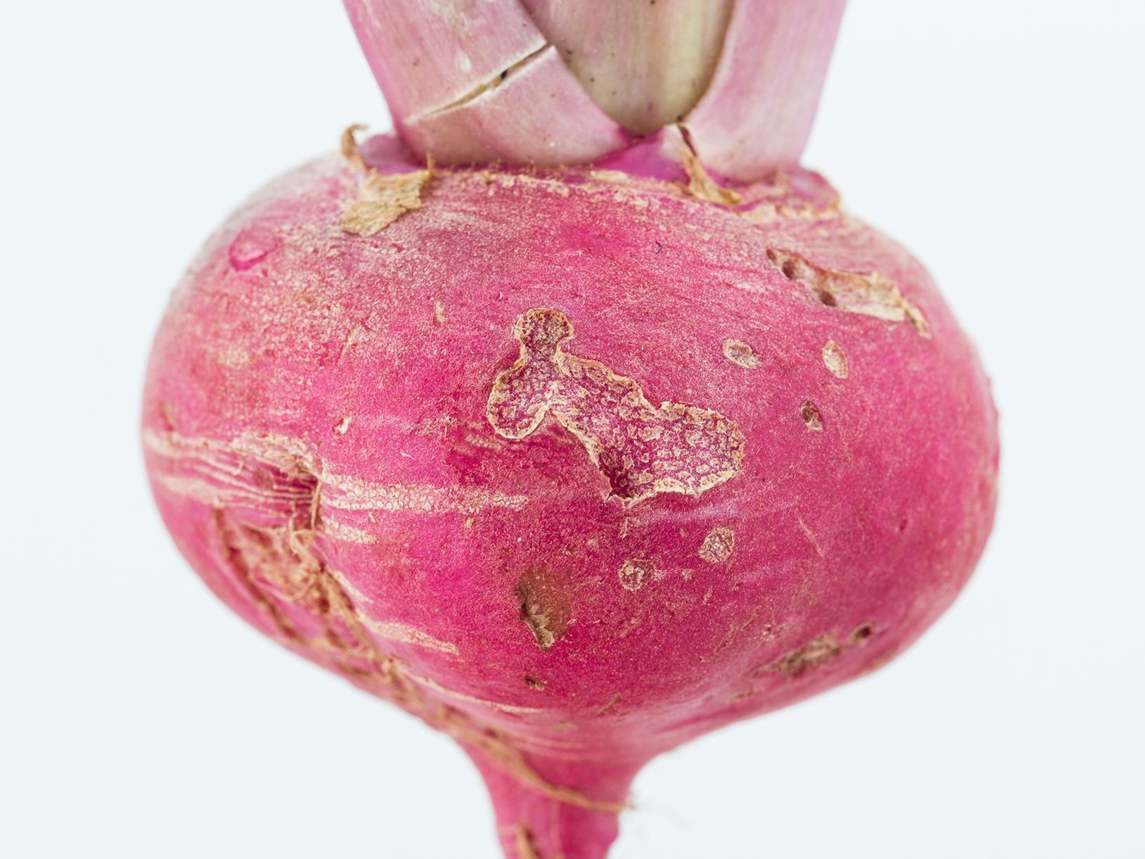 Description: Radis présentant des dommages de larves de l'altise des navets : les larves de cette espèce se nourrissent des racines de leurs plantes hôtes. Les racines de navets attaquées par Phyllotreta striolata sont recouvertes de galeries superficielles. Des galeries plus profondes sont aussi parfois présentes.