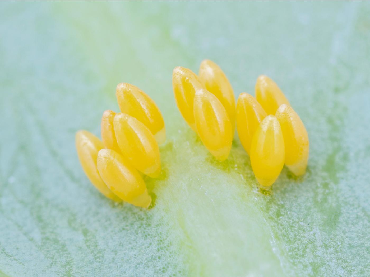 Oeuf : 1,2 mm de long; de forme allongée avec une surface lisse; de couleur jaune pâle à orangé; devient grisâtre avant l’éclosion.