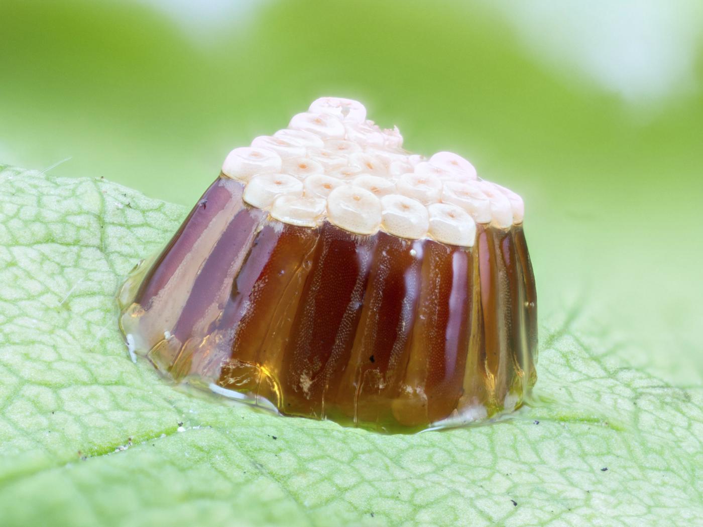 Oeuf : 2 mm; de forme tubulaire et de couleur caramel avec un sommet plat et circulaire pâle; les oeufs sont pondus en masse et sont cimentés par une substance brunâtre et luisante.