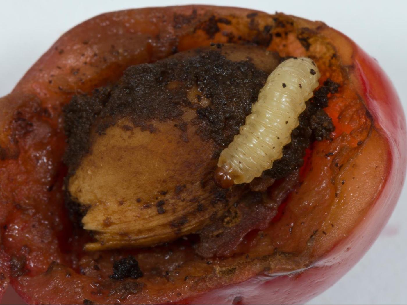 De plus, le développement des larves cause l'apparition de déformations et d'anomalies de coloration ainsi qu'un murissement prématuré et la chute des fruits. Bien que les prunes soient les fruits les plus vulnérables à cet insecte, les pommes, les cerises ainsi que les bleuets sont très à risques de subir des dommages si aucune méthode de lutte n'est effectuée contre ce ravageur.