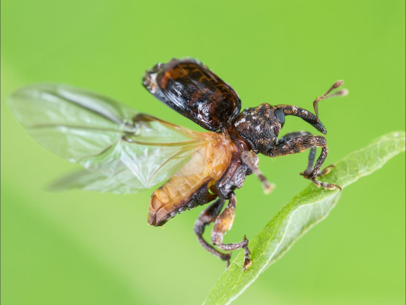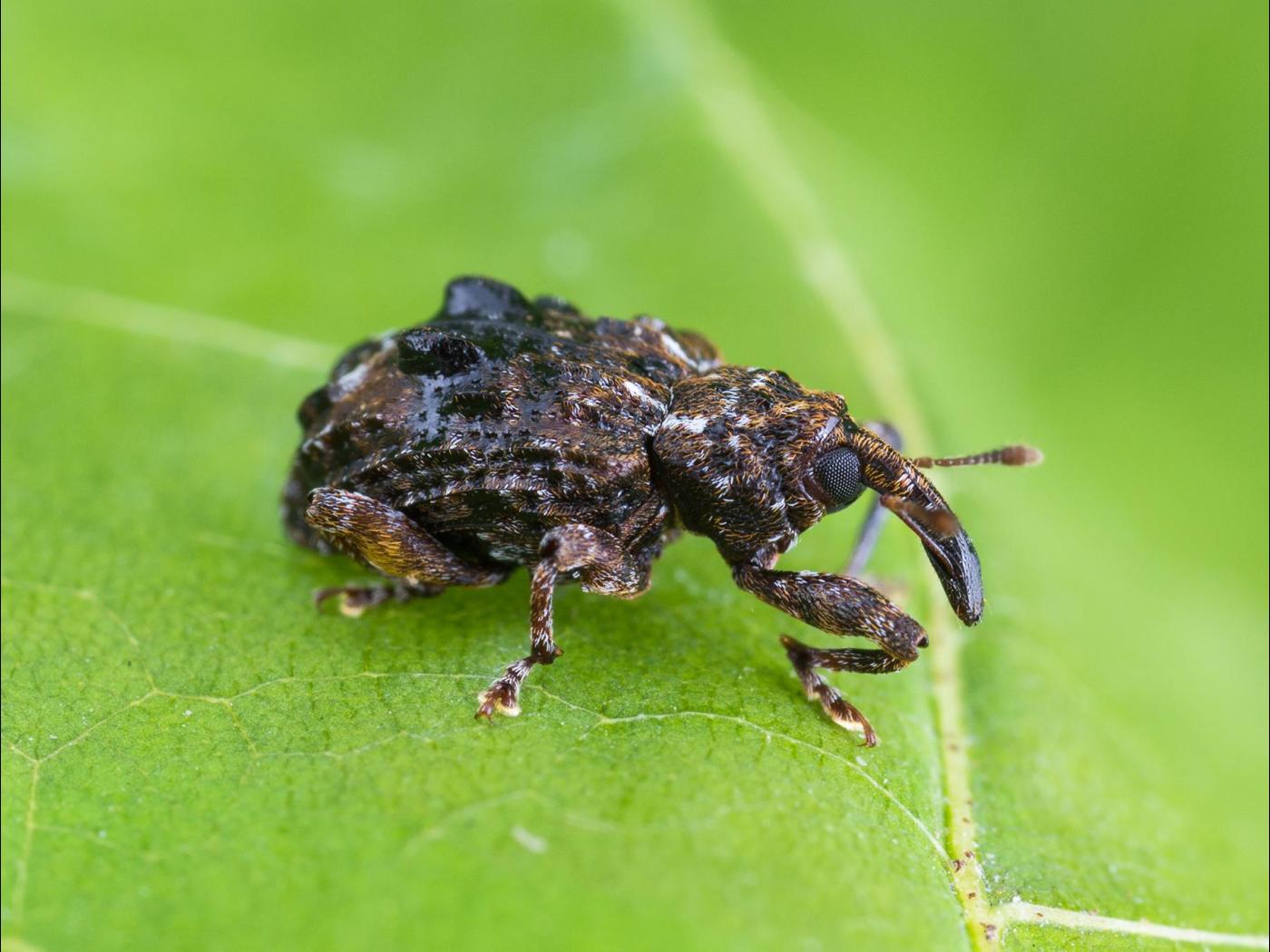 Adulte : 4,5 à 6,5 mm; le corps est marbré de noir, de brun et de gris; les pièces buccales sont longues et en forme de trompe; une série de gros tubercules est présente sur les élytres.
