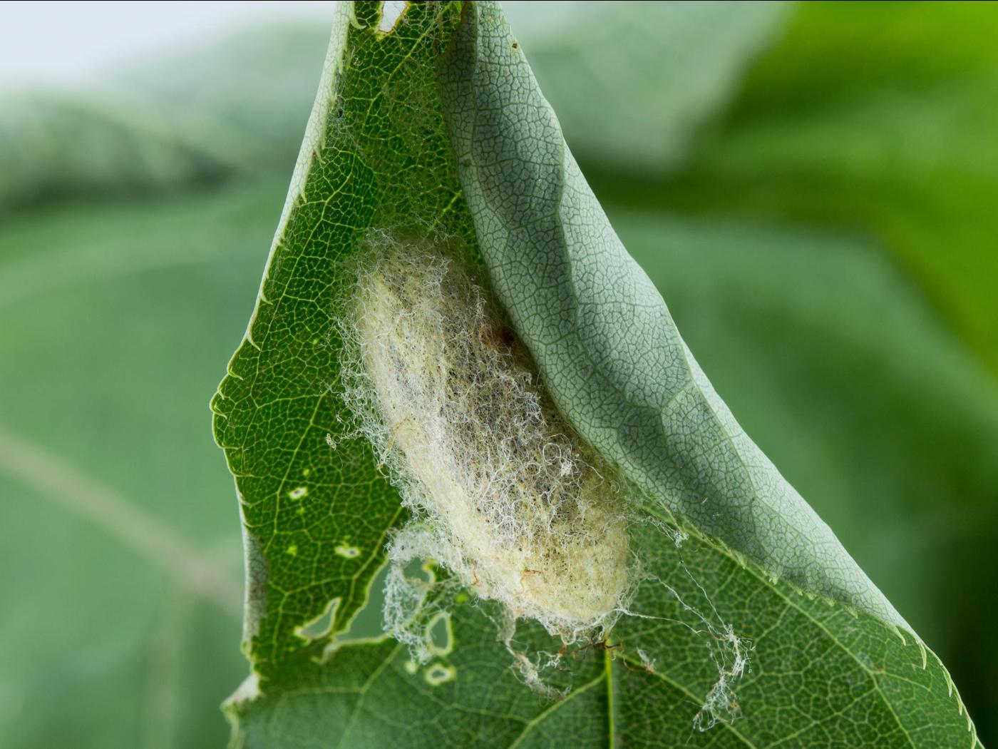Chrysalide : 20,0 mm; elle est brune à noire et enfermée dans un cocon composé de soie jaunâtre et recouvert de poudre floconneuse jaune.