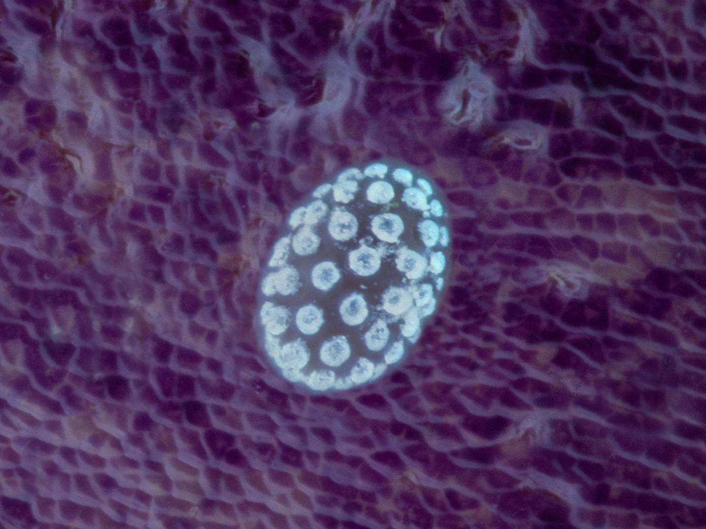 Oeuf : 0,08 mm; de forme elliptique, la surface est ornée de nombreux tubercules ronds et blanchâtres.