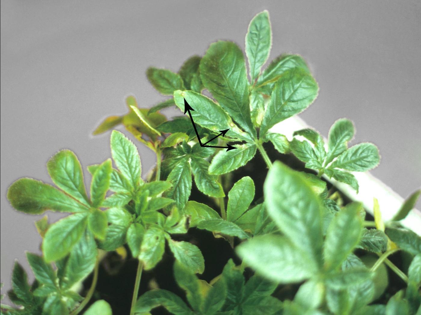 Description: Sur des plants de cléome épineux cultivés en serre, présence de taches beiges à brunes, de forme irrégulière ou en anneau, débutant souvent à la marge des feuilles (voir flèches). La nature des symptômes et les observations effectuées à l’aide d’une loupe ont permis d’identifier le champignon Alternaria sp., responsable de la tache alternarienne.