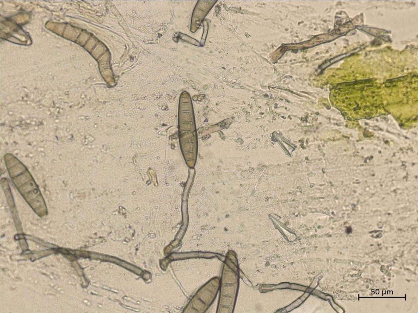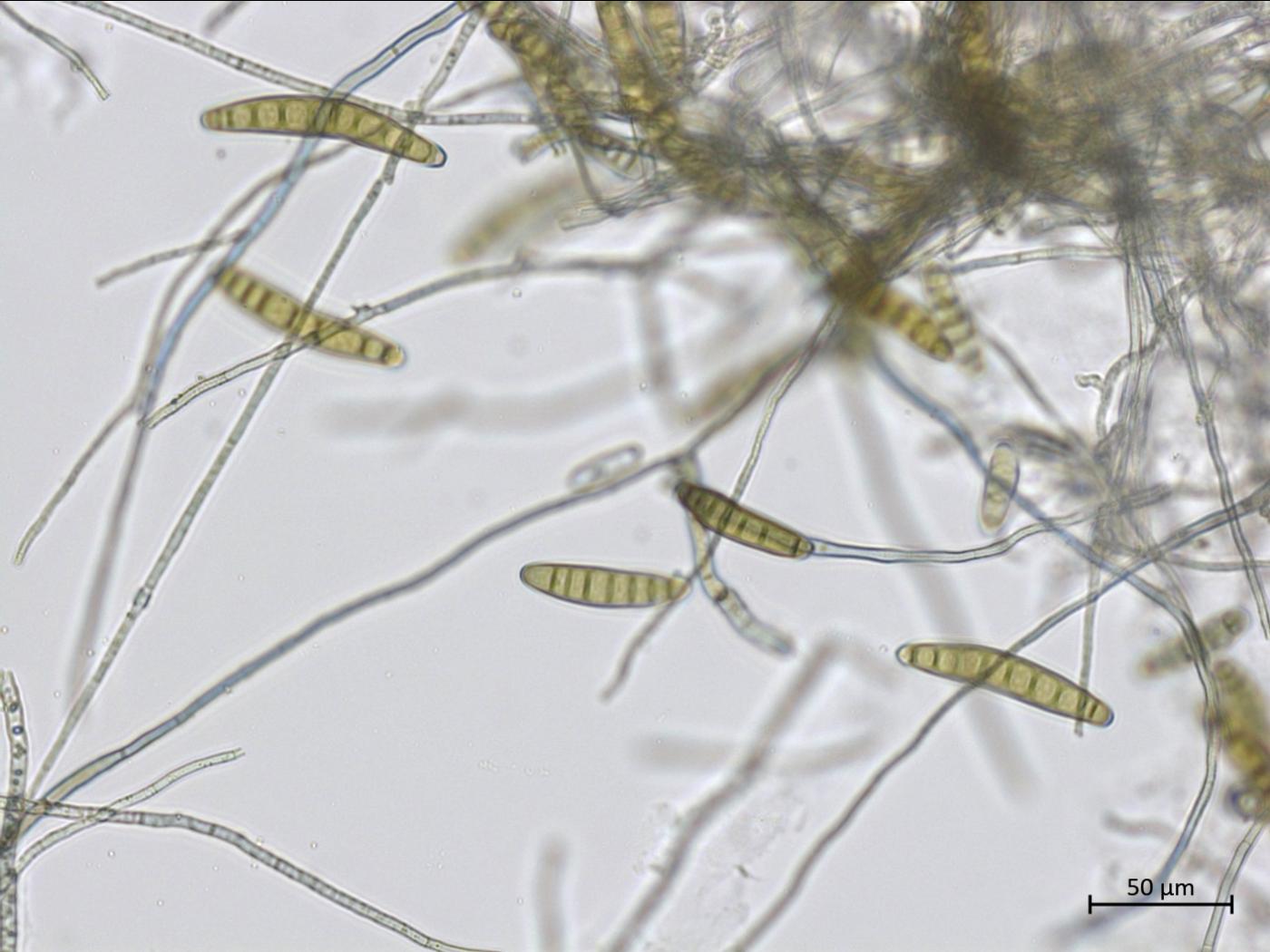 - Mycélium : Hyphes hyalines, brun pâle à brun foncé ou gris.