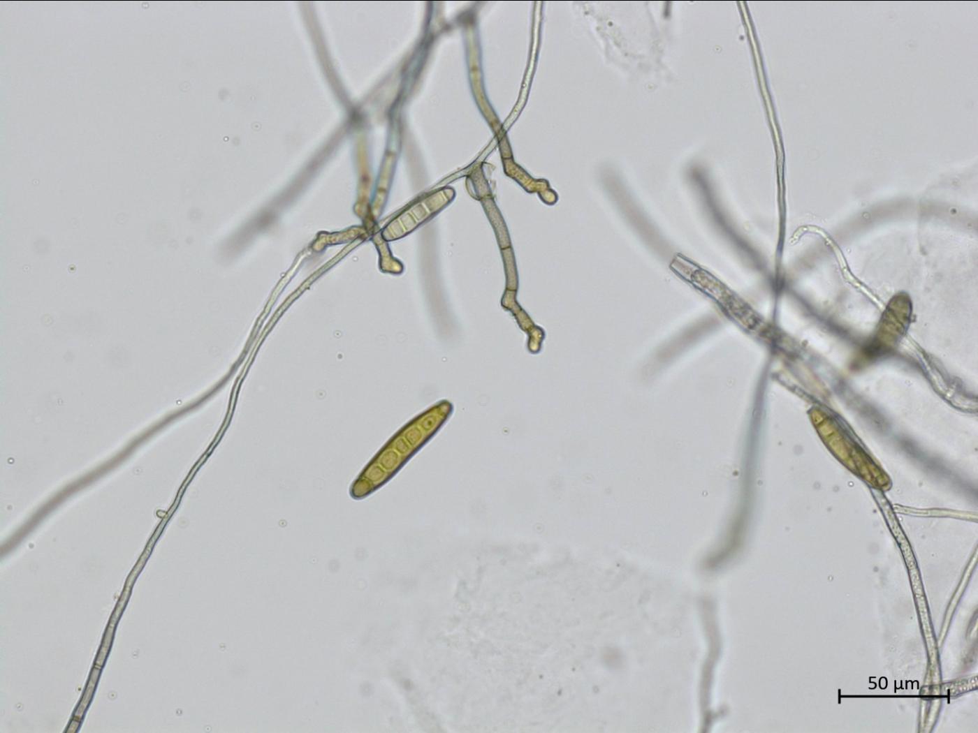 - Conidiophores : Conidiophores septés, brun pâle à brun foncé, en forme de zigzag (= conidiophores géniculés au niveau des septations); ce type de conidiophores résulte d'une croissance sympodiale, c’est-à-dire qu'un nouveau segment de conidiophore se développe et s'allonge juste à côté de la conidie localisée à l'apex. Un pore peut être visible là où la conidie s'est détachée.