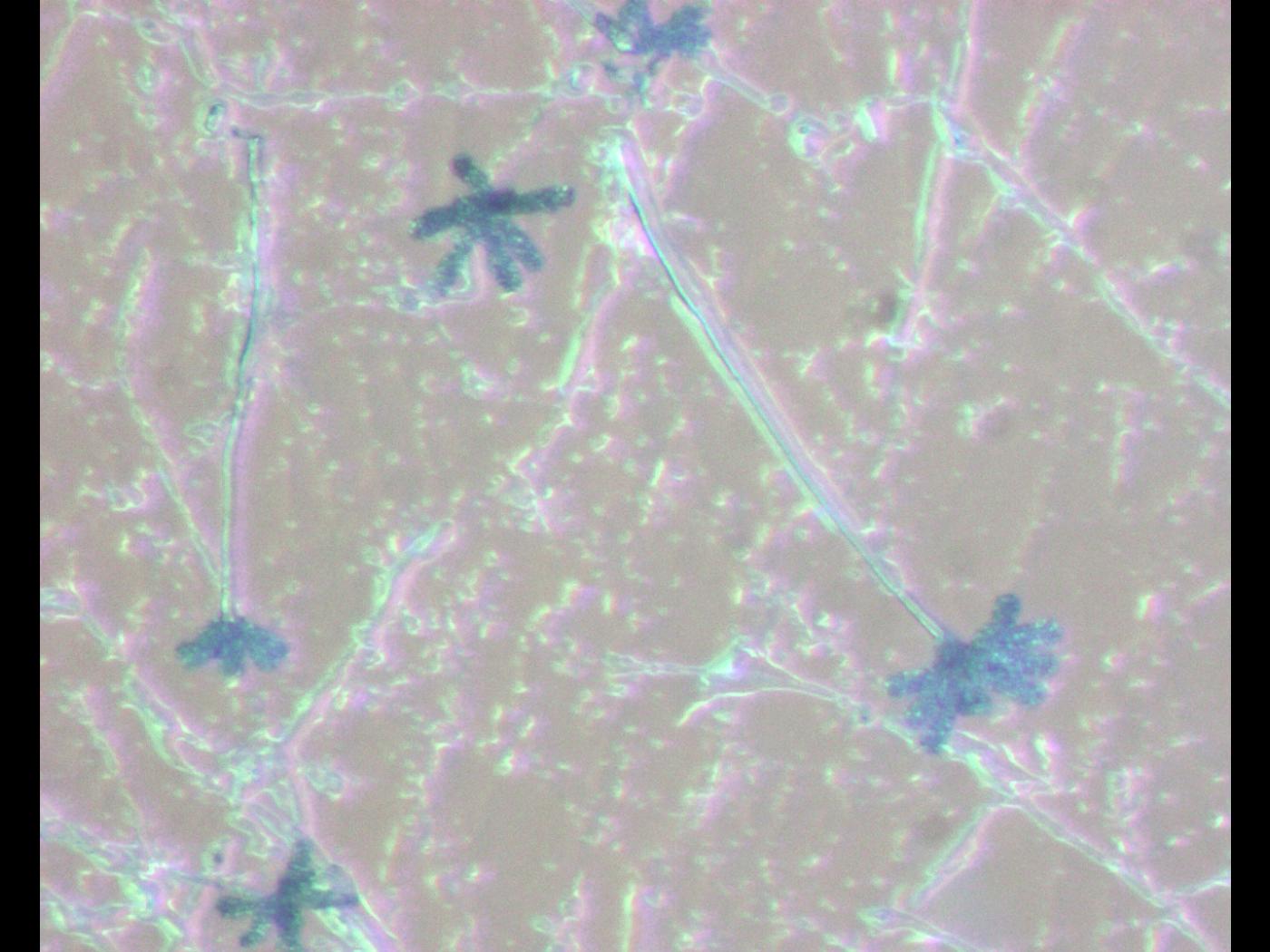 Légende: Conidiophore ramifié et conidies immatures de Chromelosporium sp. (x 100)