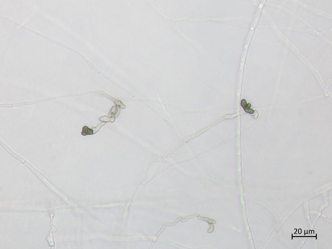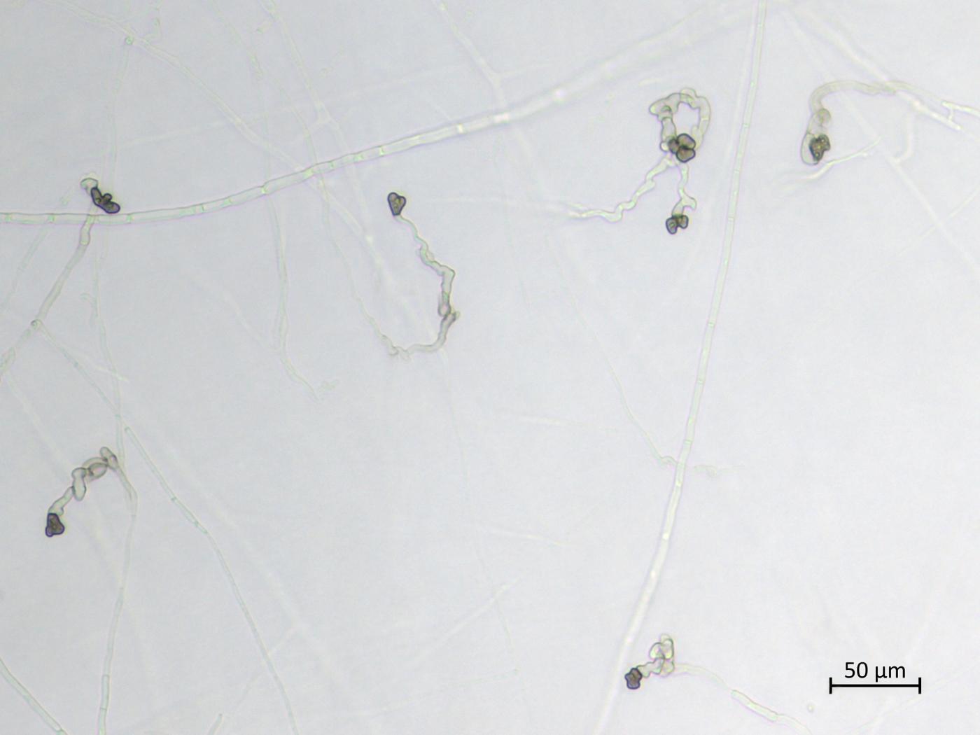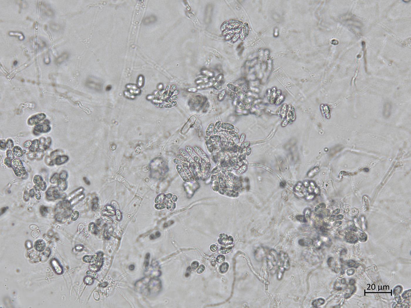 - Appressoria : Couleur cannelle. Ovoïdes ou claviformes à ellipsoïdes; parfois de forme irrégulière et lobés. Dimension : 5-14 x 4-11 µm. Visibles en dessous des mises en culture.