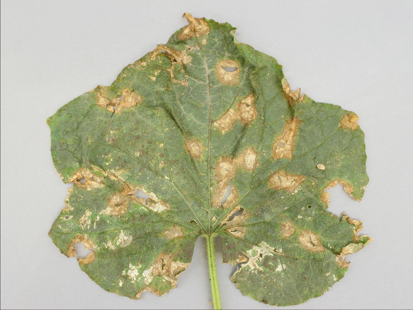 Feuille : au début, présence de taches huileuses débutant près des nervures. Elles deviennent angulaires et brunes, rouges ou noires selon la plante. Les tissus morts peuvent fendre ou tomber de la feuille (criblure). Les jeunes feuilles fortement affectées sont froissées et déformées.