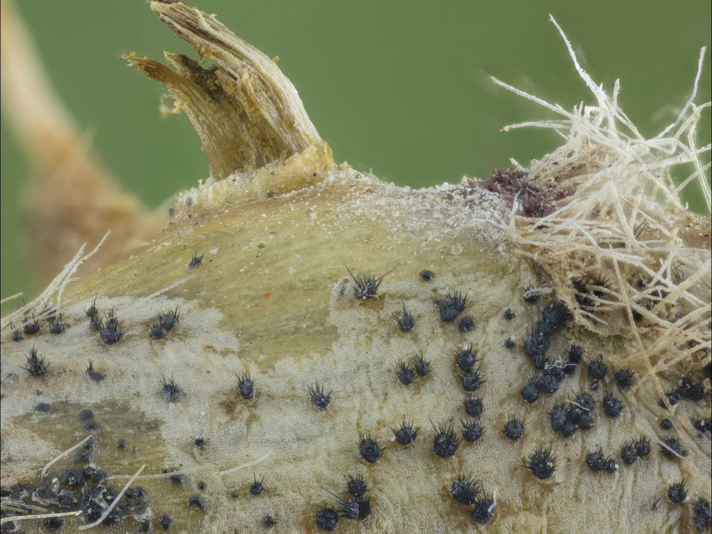 Feuille : noircissement des nervures foliaires, enroulement des feuilles, chancre entourant le pétiole et défoliation prématurée. Les feuilles basales sont affectées en premier.