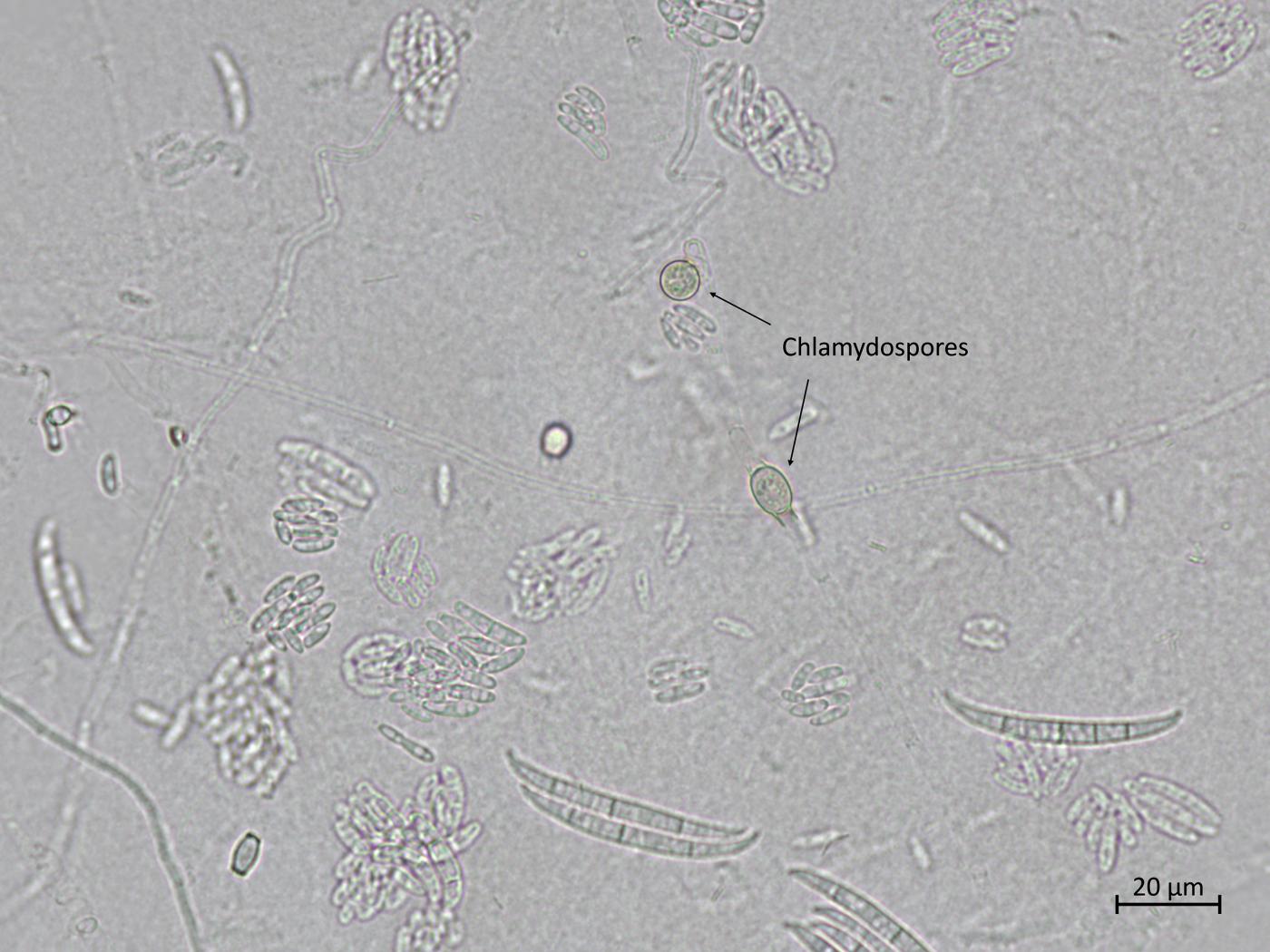 • Chlamydospores : Seules ou en chaînes de deux. Intercalaires ou terminales. Uniformes et globuleuses. Paroi épaisse et lisse. Formées à partir des hyphes ou des macroconidies.