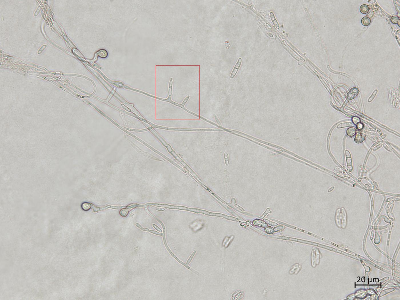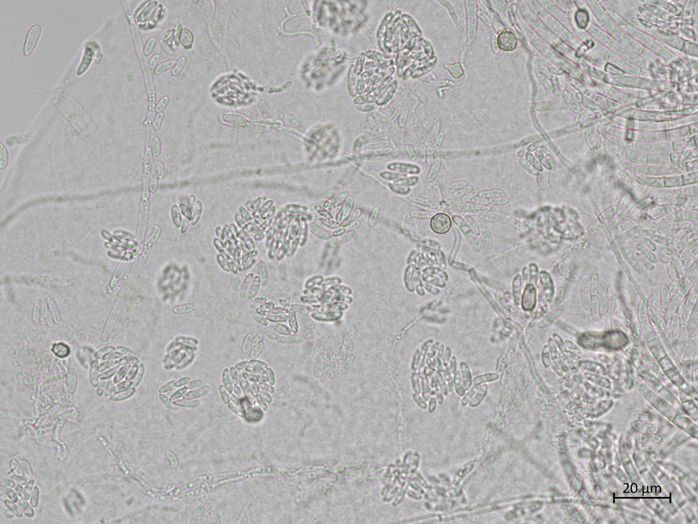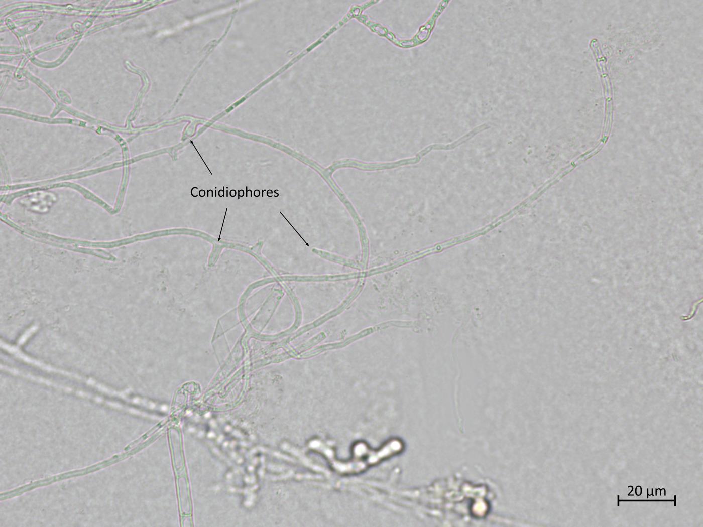 • Microconidies : 0 septation (= amérospores) (habituellement) / 1 septation (= didymospores) (rarement). Agglomérées en "fausses têtes". Hyalines. De forme variable (ovale/ellipsoïde à cylindrique). Droites ou incurvées. Dimension : 5-12 x 2,2-3,5 μm. Produites par de courtes monophialides (absence de polyphialide) qui sont localisées latéralement sur l'hyphe ou sur de courts conidiophores faiblement ramifiés.