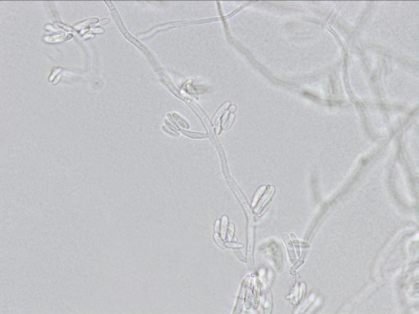 • Microconidies : Abondantes. 0 septation (= amérospores). Claviformes (= en forme de massue), cylindriques ou pyriformes (= en forme de poire). Produites en chaînes ou agglomérées en "fausses têtes". Produites par des monophialides ou polyphialides. Dimension : 3-19,5 x 2-5 μm.