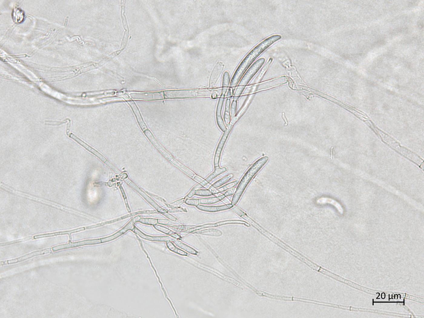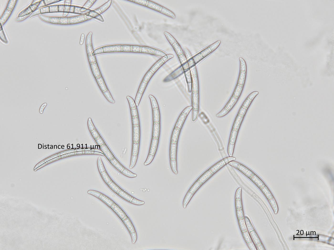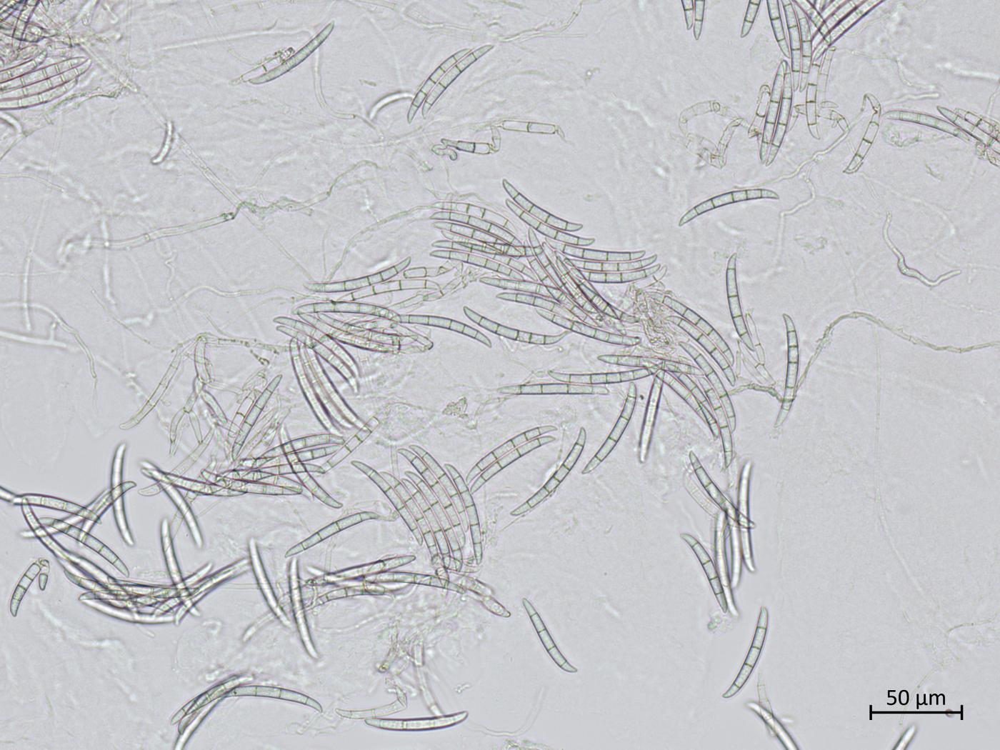 Macroconidies : Phragmospores à 3-5 septations transversales (généralement 3 septations). Fusiformes-cylindriques et légèrement arquées, côté dorsal et ventral parallèles sur une certaine longueur. Cellule apicale plutôt arrondie. Cellule basale variable (arrondie, en forme de pied ou papillée). Parfois regroupées en sporodochies crème (jamais orange). Dimension : 25-42 x 4-6 µm (si 3 septations).