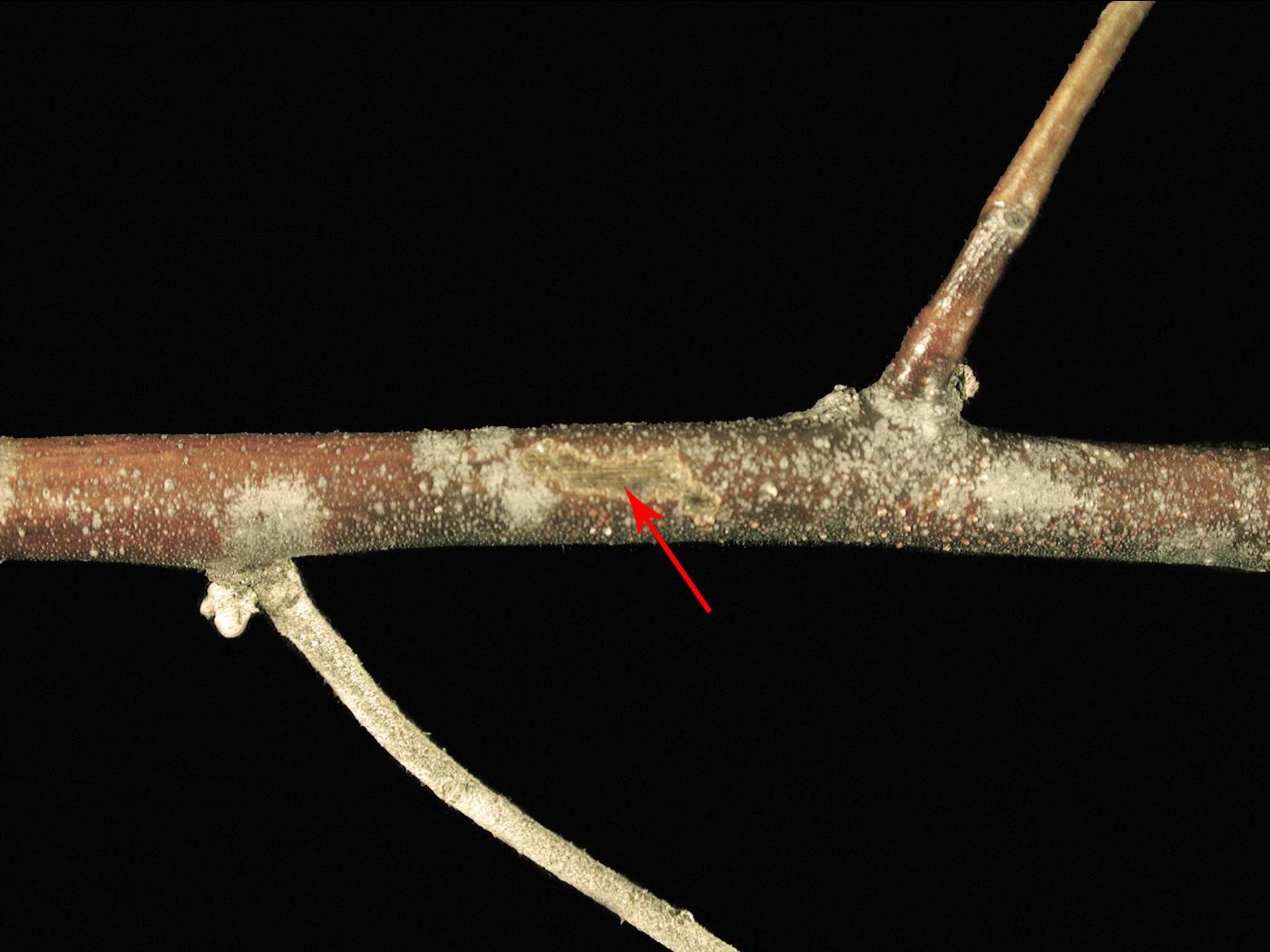 Tige/tronc : sur l’écorce, présence de chancres brun rougeâtre à la marge et brun foncé à noirs au centre. Les chancres mesurent entre 10 et 30 cm et l’écorce s’affaisse. Les chancres prennent de l’expansion, peuvent éclater ou entourer le tronc ou les branches qui finissent par dépérir et mourir. Présence de pycnides noires au centre des chancres qui prennent alors un aspect rugueux. Des exsudats de gomme ambrée peuvent apparaître des fissures dans l’écorce des arbres plus âgés. Le système vasculaire est brun rougeâtre.