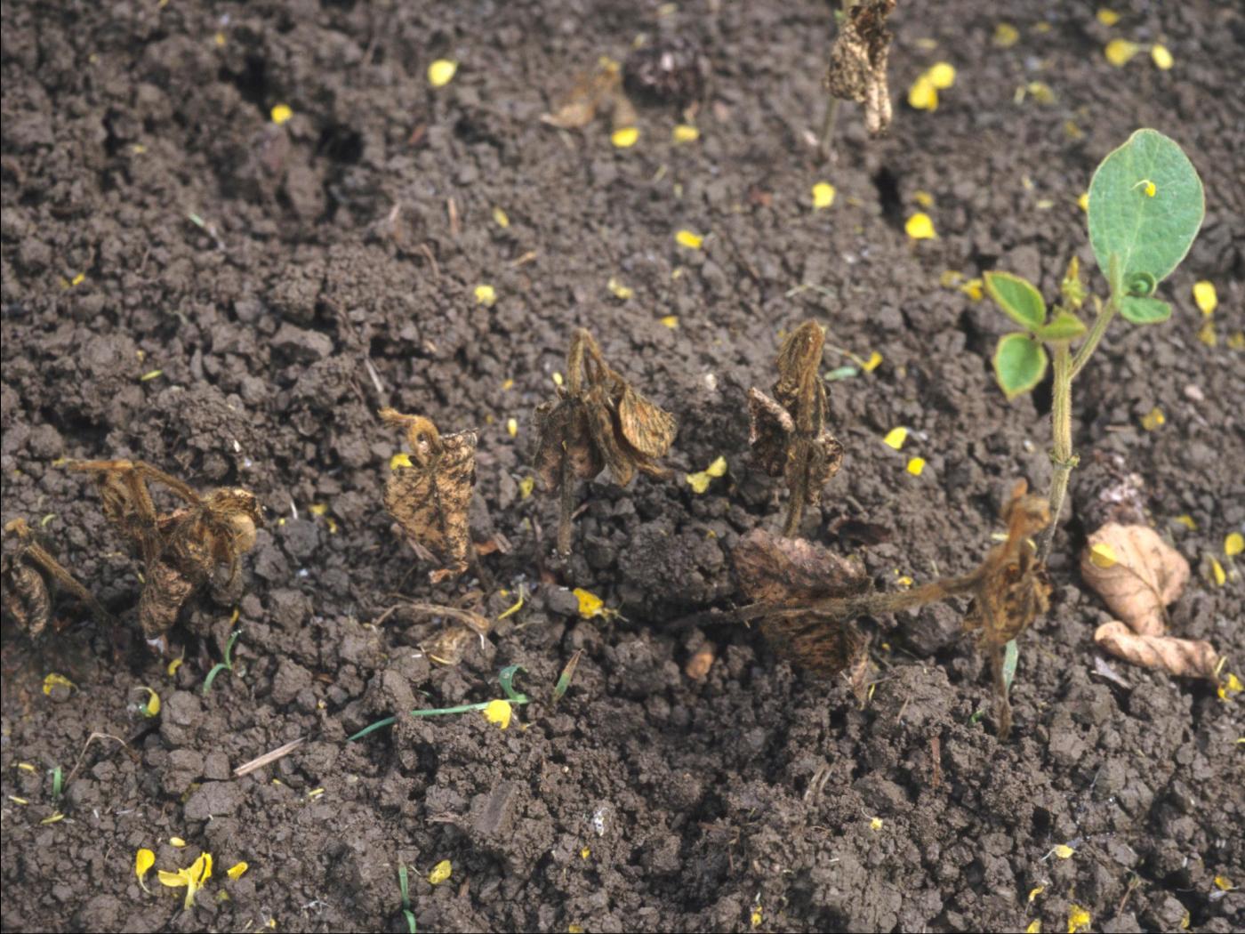 Semence et plantule : présence d’une pourriture molle brun pâle sur les semences, cotylédons, hypocotyle et racines. Les feuilles sont jaunes et flétries. La plantule peut mourir.