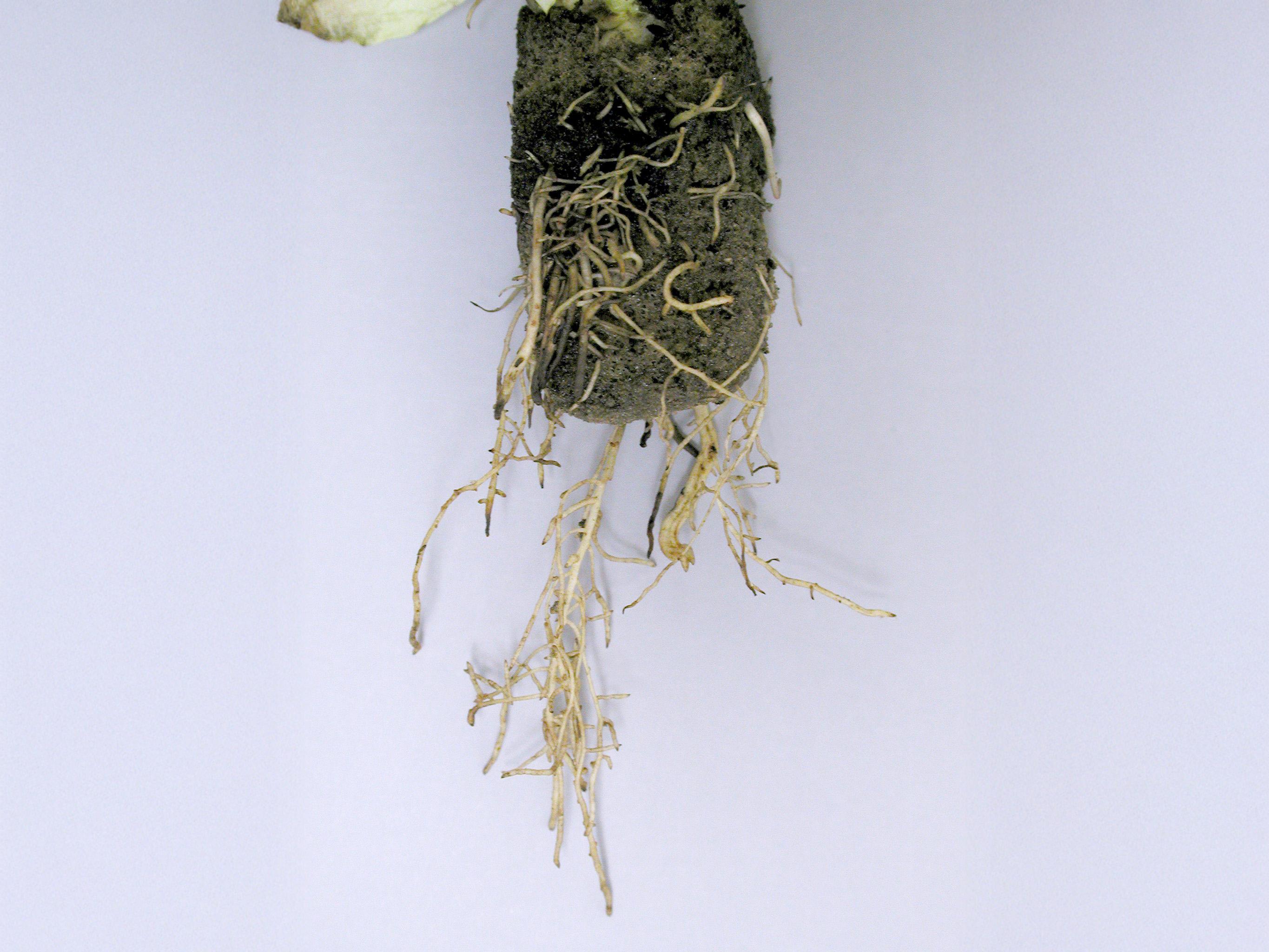 Racine : présence de quelques petites lésions brunes qui s’agglomèrent pour former de longues lésions humides. Le système racinaire devient brun-orangé à rouille et les racines peuvent pourrir. Le système racinaire est faiblement développé, avec peu ou pas de racines latérales et de radicelles. Pourriture du cortex des racines et du pivot. Le cortex pourri peut se séparer facilement de la stèle qui demeure intacte. Les radicelles et les racines latérales sont les portes d’entrée pour les Pythium.