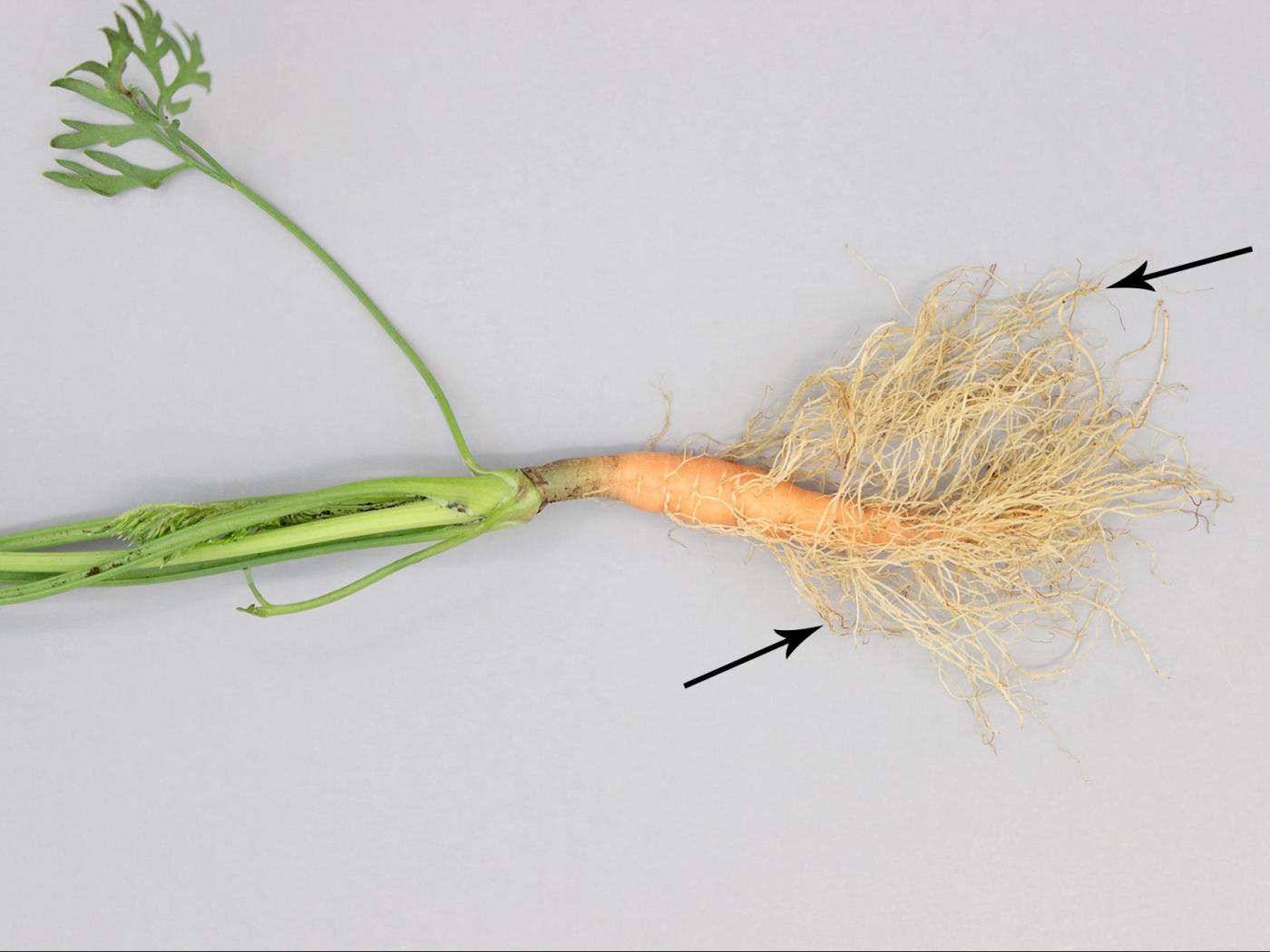 Ces symptômes peuvent être confondus avec des dommages causés par les nématodes (renflement de l’extrémité des racines), la compaction du sol, un excès d’eau dans le sol ou un drainage déficient.
