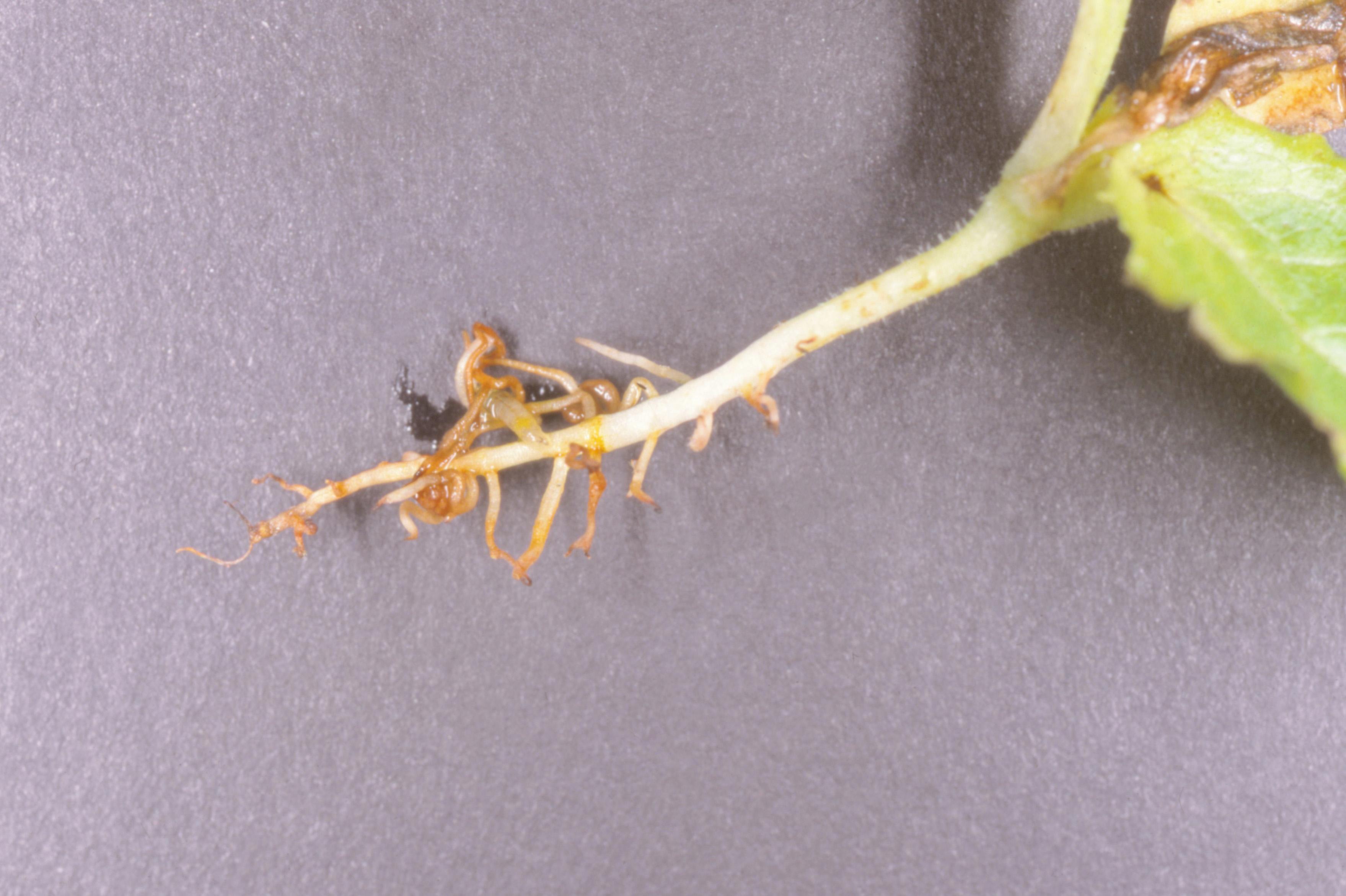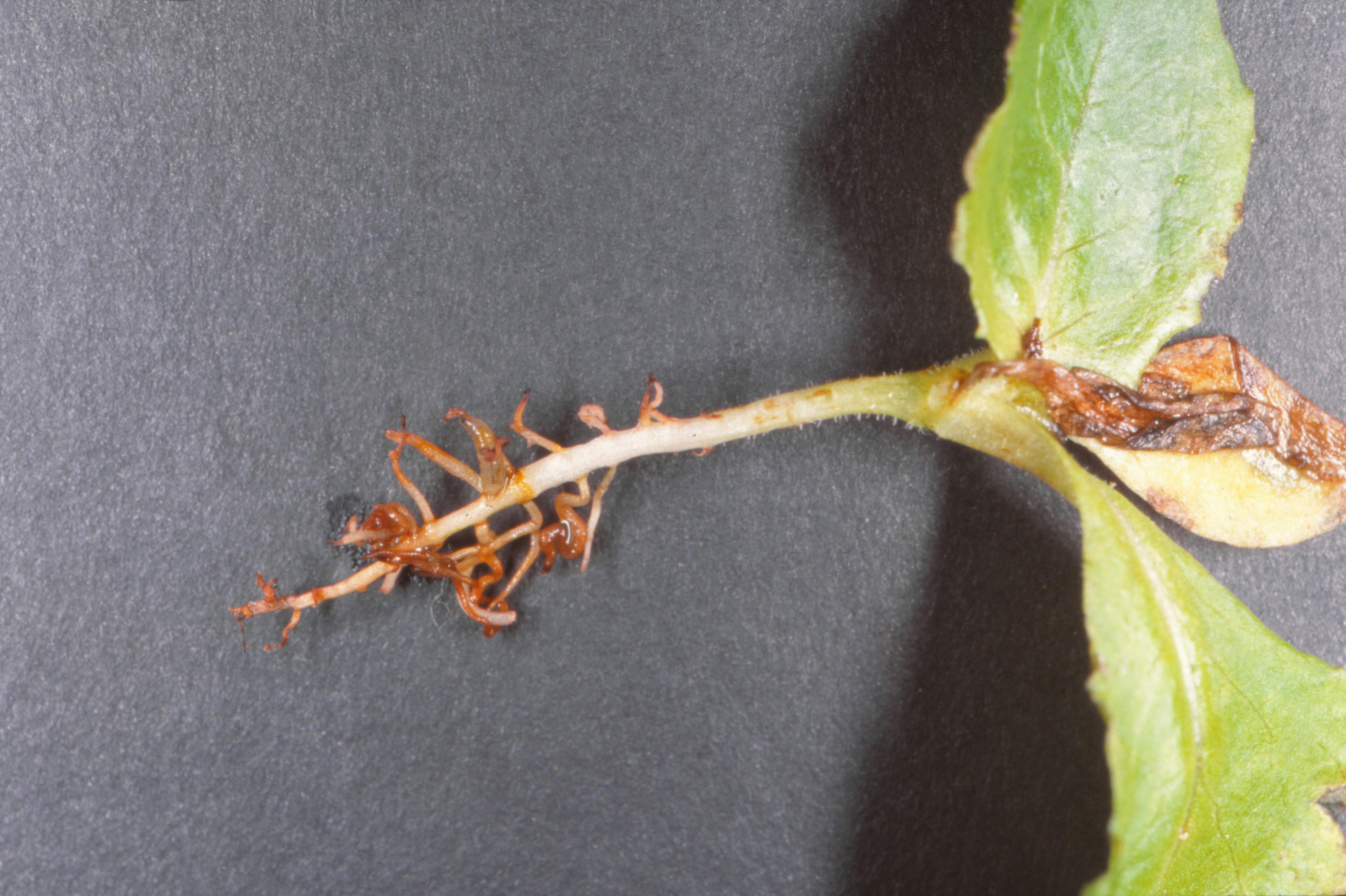 Racine : brunissement de l’apex qui prend une apparence huileuse. Le système racinaire devient brun clair et le cortex peut se séparer facilement de la stèle qui demeure intacte. Le système racinaire est faiblement développé, avec peu ou pas de racines latérales et de radicelles.