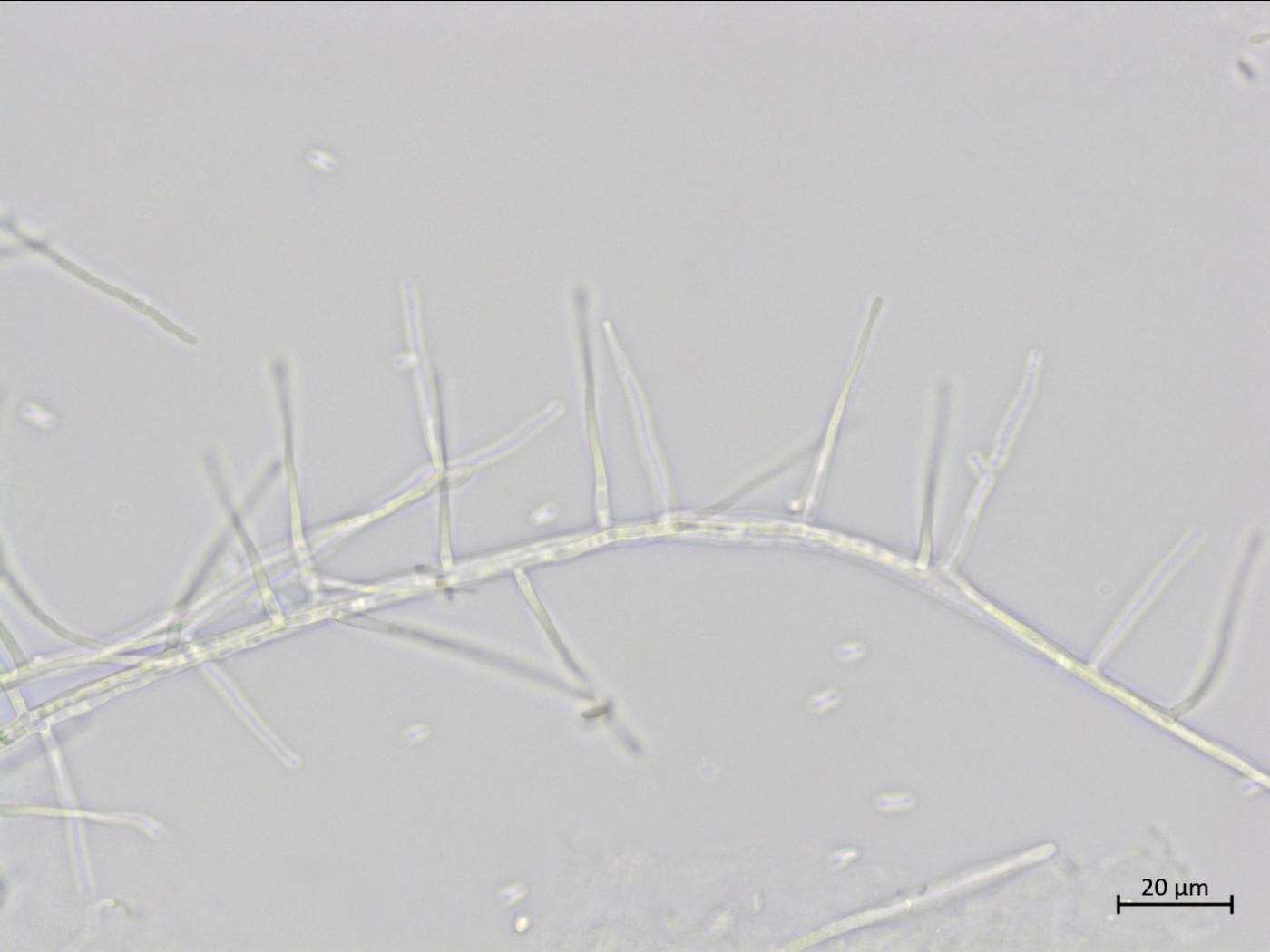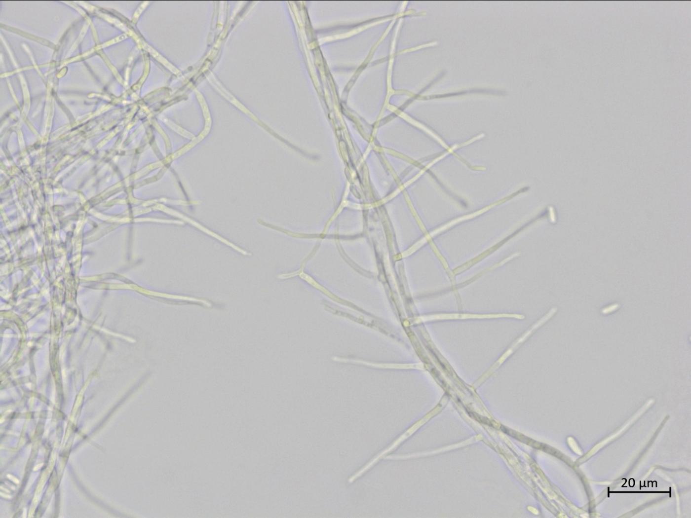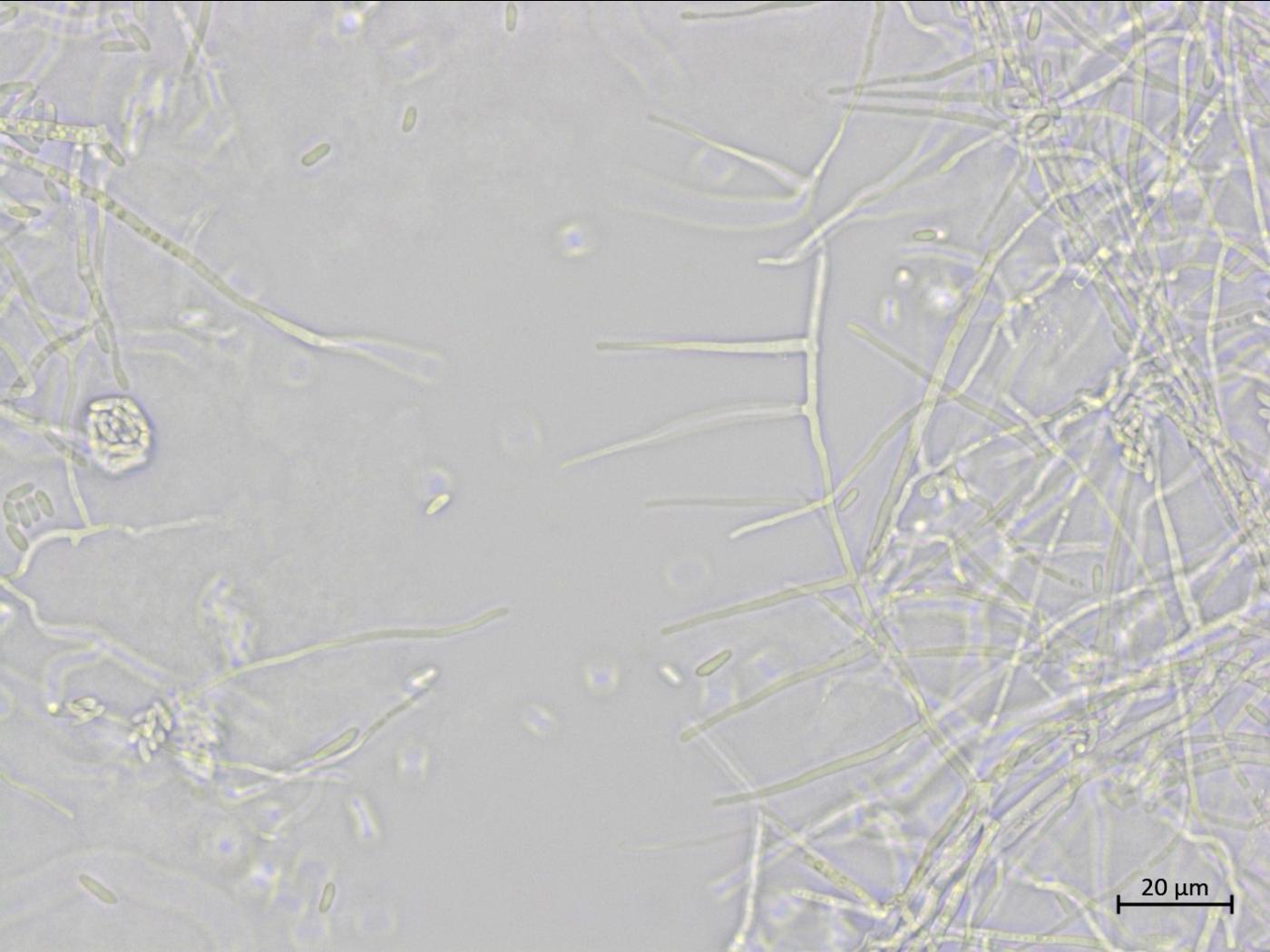 Légende: Hyphes et amas de conidies de Sarocladium strictum.