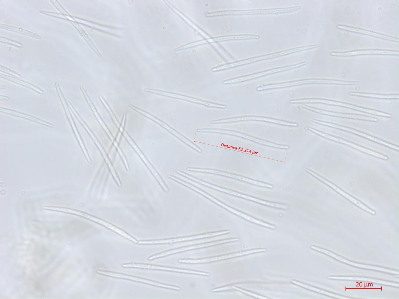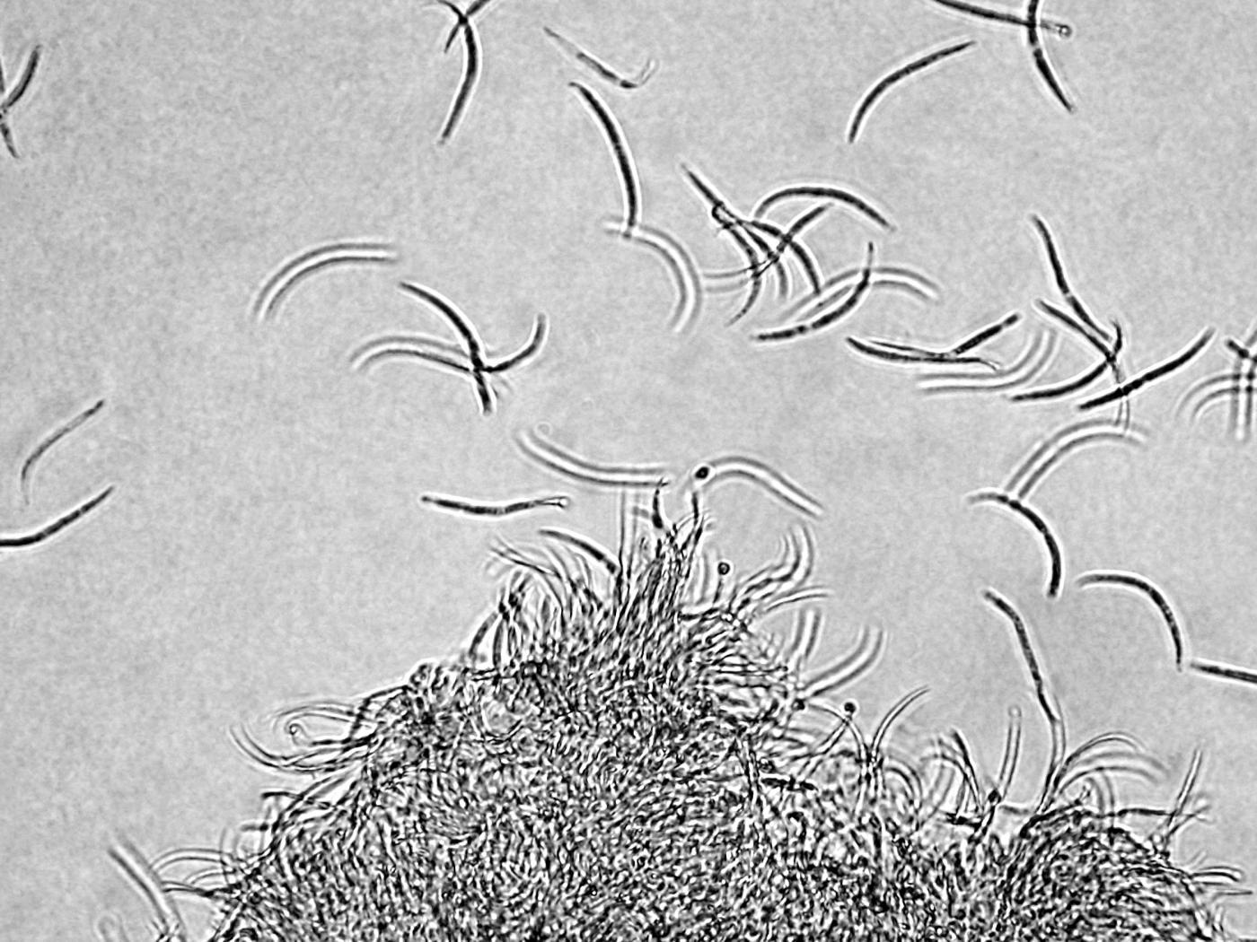 Légende: Exsudat de conidies s'écoulant de pycnides de Septoria sp., directement d'un tissu foliaire (Loupe binoculaire)