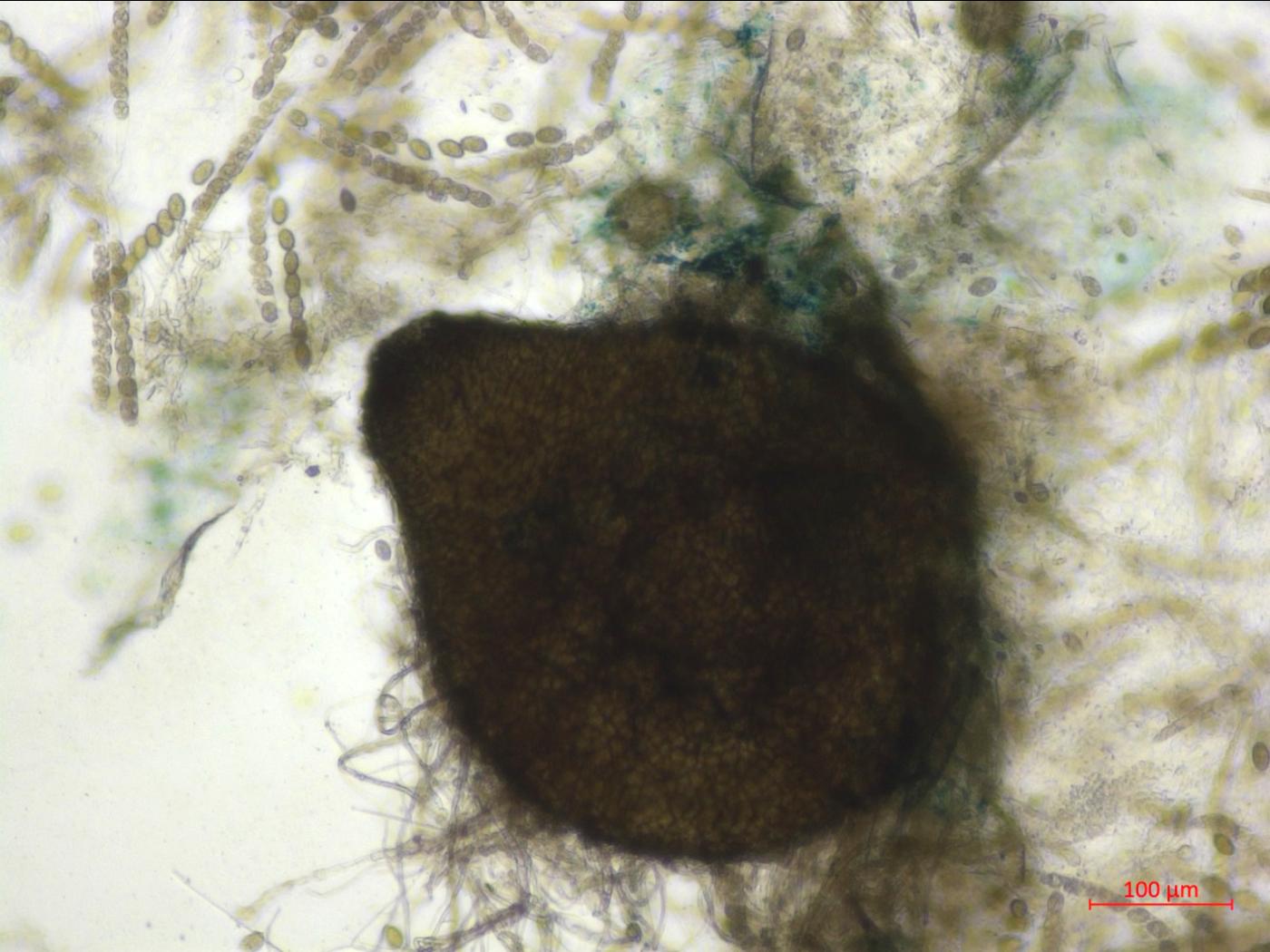 • Fructification : Périthèce brun foncé à noir. Obpyriforme (= en forme de poire inversée). À paroi glabre, d'une épaisseur de 3-4 couches de cellules. Solitaire, non disposé sur un stroma. À l'intérieur du périthèce, des paraphyses se forment avant l'apparition des asques. Les paraphyses sont filamenteuses dans les jeunes périthèces, deviennent vésiculeuses et ne sont parfois plus visibles dans les périthèces matures, car ont tendance à se désintégrer.