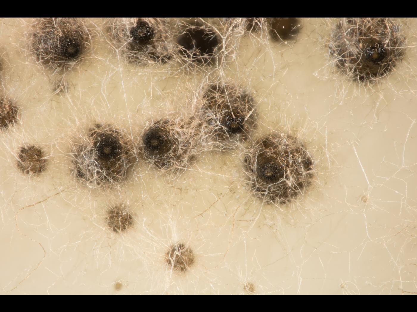 Légende: Périthèces de Sordaria sp. sur milieu de culture gélosé SNA (Stéréomicroscope)
