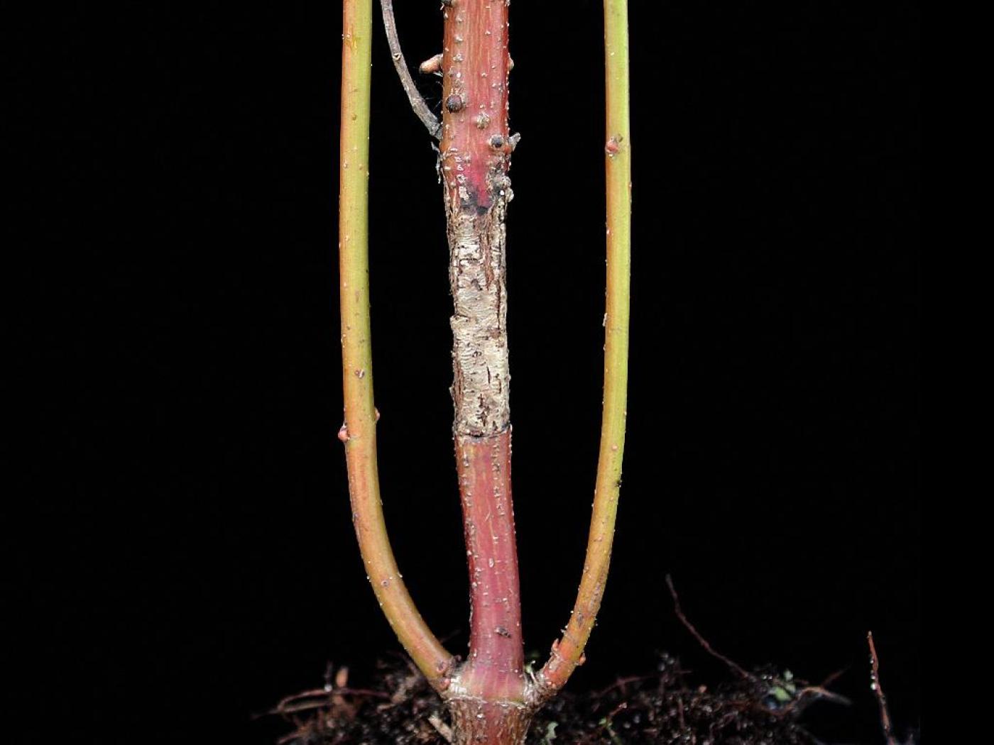 Tige : présence de chancres bruns à noirs, superficiels et qui encerclent partiellement ou totalement la tige. Une bordure rouge délimite parfois le chancre sur l’épiderme.