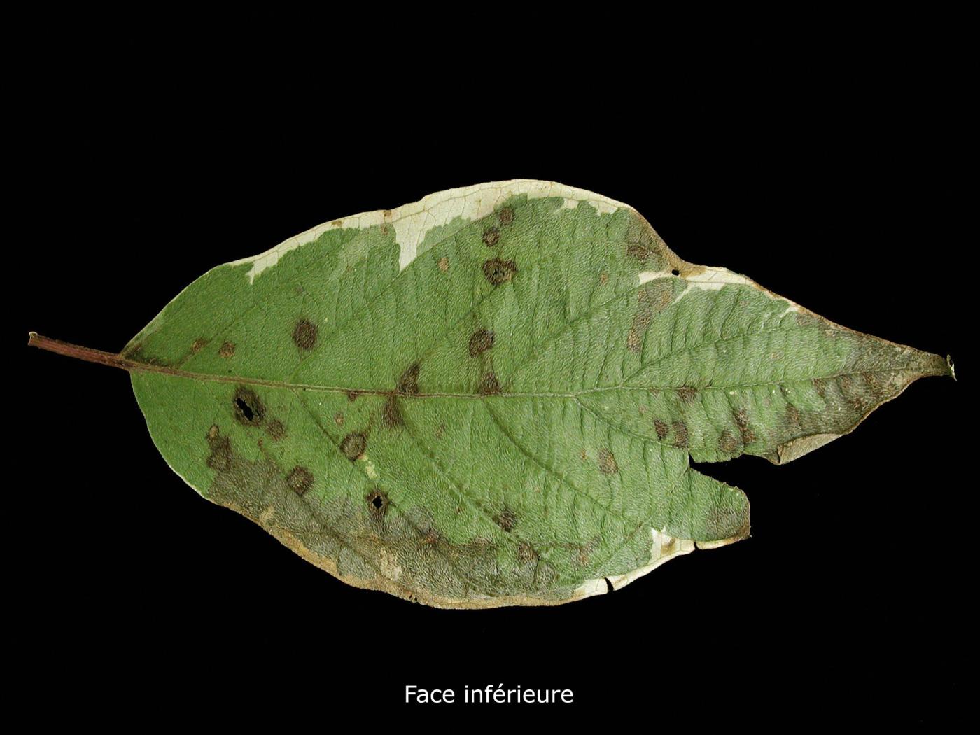 Description: À la face inférieure d’une feuille de cornouiller blanc ('Elegantissima') provenant d’une pépinière, présence de taches circulaires à angulaires, brunâtres et sans halo jaune. Le diamètre des taches varie entre 1 et 3 cm. Elles sont près des nervures et il y a entre 15 et 25 taches par feuille. Les tests de laboratoire ont révélé la présence du champignon Septoria cornicola, responsable de la tache septorienne.