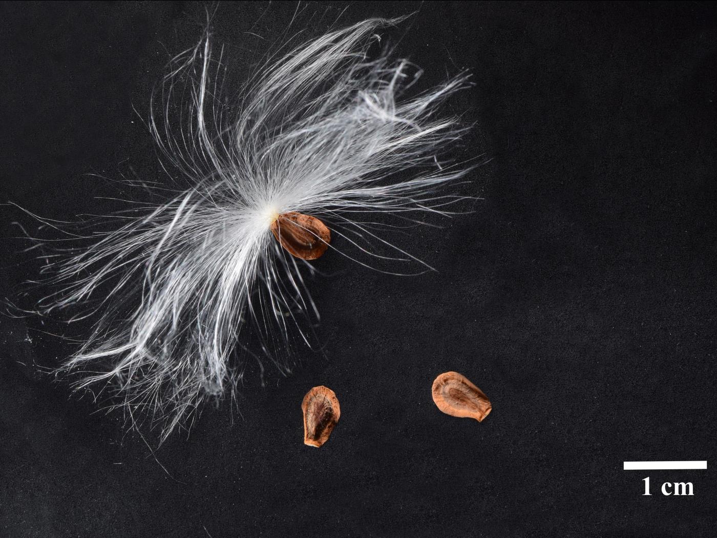 Les fruits sont des follicules vert grisâtre qui mesurent de 7 à 12 cm de longueur et environ 2,5 cm de largeur. Ils pendent sur les pédicelles recourbés et ont une forme conique inversée semblable à une banane. La surface est pubescente et couverte de protubérances. Les follicules s'ouvrent sur un côté à maturité pour libérer les graines. Ces dernières mesurent de 7 à 8 mm de longueur et sont de couleur brune. Elles sont de forme ovale, aplatie et sont munies de très longues soies blanches.