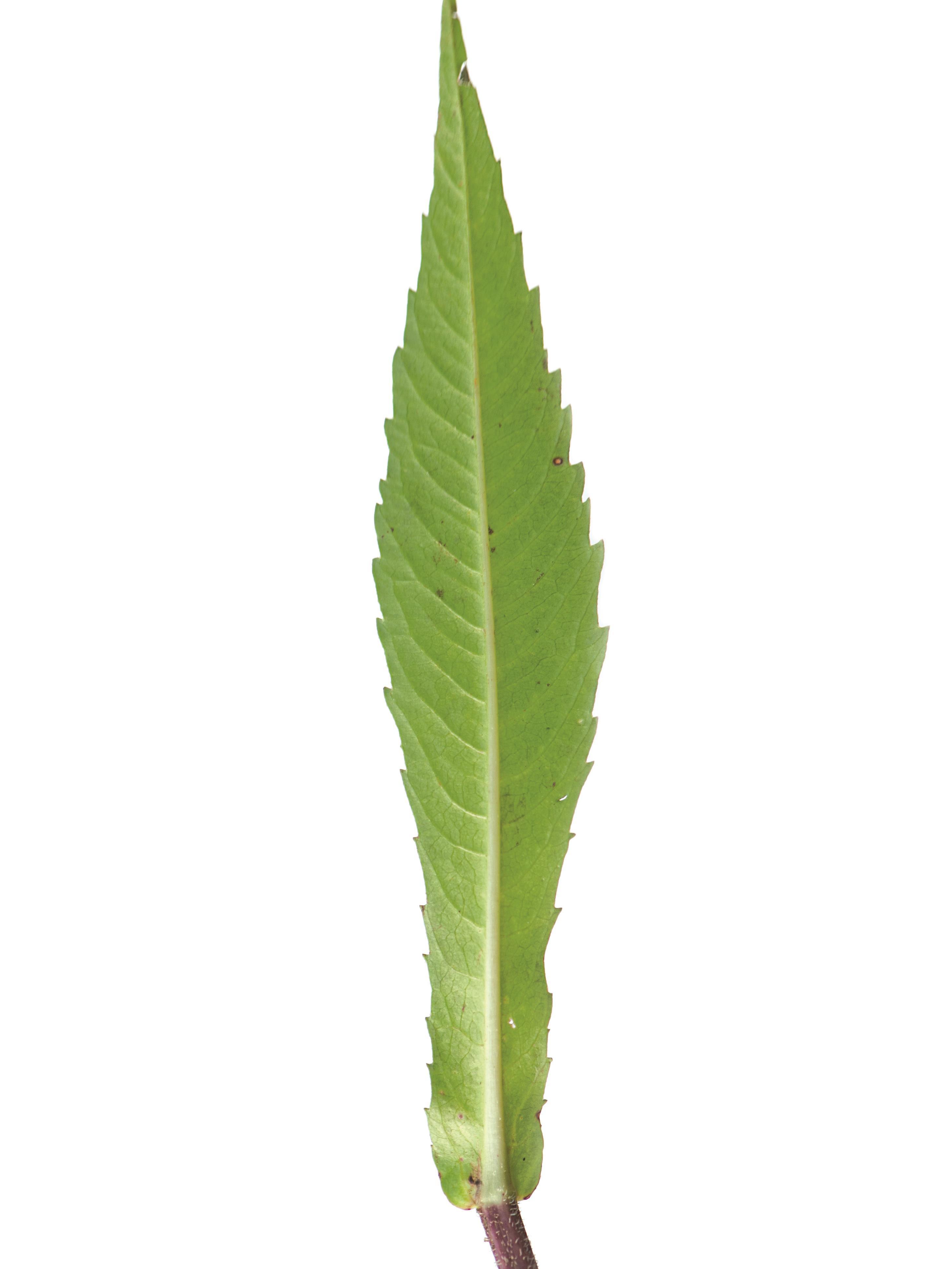 Les feuilles sont opposées, pouvant être soudées par la base autour des nœuds de la tige. Le limbe est de forme lancéolée à linéaire, il mesure de 4 à 10 cm de longueur et de 0,5 à 2,5 cm de largeur. La marge est de plus en plus dentée vers le haut de la plante. La nervure centrale est proéminente.