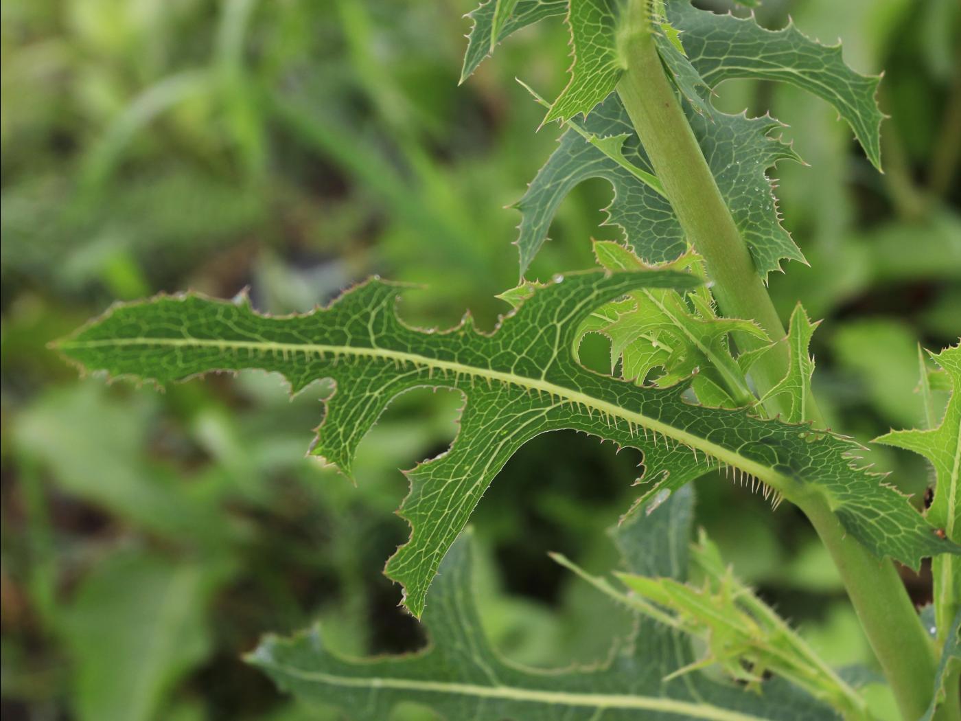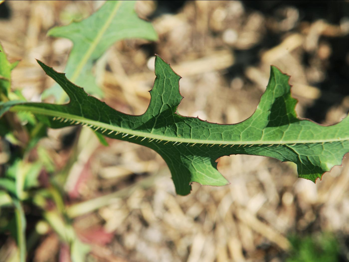 Les feuilles basales forment une rosette. Elles sont entières, ovales à allongées et à bord sinué à sinué-denté. Elles sont plus larges près de l’apex. La bordure du limbe est munie de dents fines, épineuses, mais non piquantes. Une ligne d’épines est présente sous toutes les feuilles à la nervure centrale. Les feuilles caulinaires sont alternes et profondément divisées en lobes avec les marges dentées et épineuses. Elles mesurent de 5 à 25 cm de long. Elles sont sessiles et entourent la tige avec 2 oreillettes aiguës présentes à la base de la feuille.