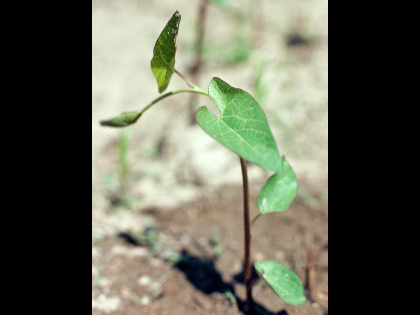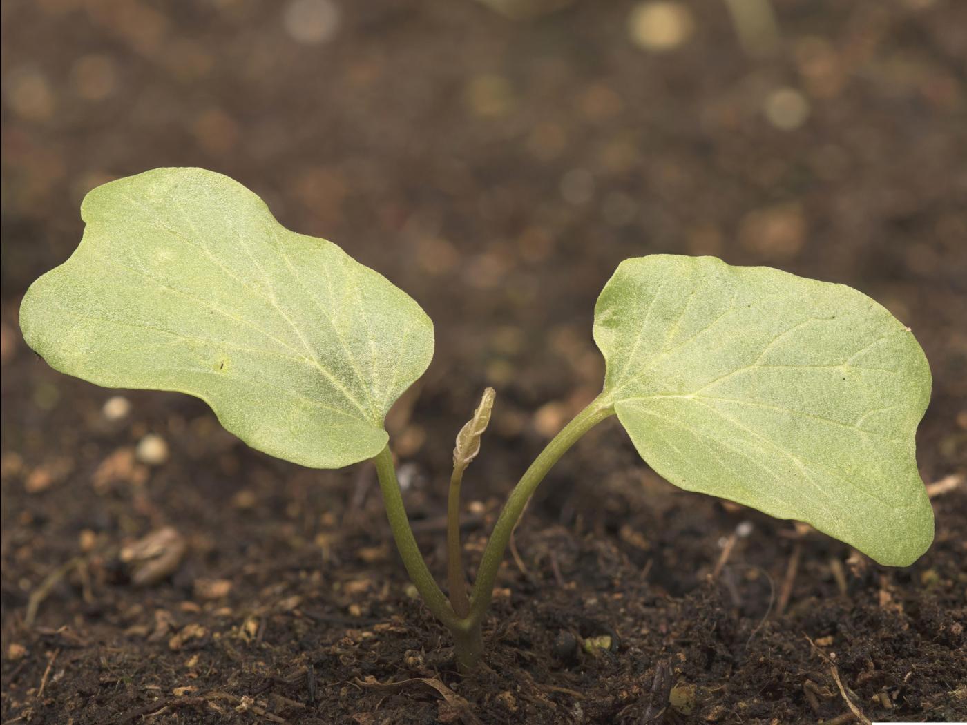 La plantule se compose de feuilles alternes sur une tige qui est souvent colorée de brun rougeâtre. Les cotylédons mesurent de 1 à 3 cm de longueur et de 1,5 à 2 cm de largeur. Ils sont de forme carrée, à sommet échancré et à base légèrement cordiforme. Des nervures blanchâtres sont présentes sur le limbe. Les cotylédons sont portés par un pétiole qui mesure de 2 à 3 cm de longueur. Les premières feuilles sont semblables aux feuilles matures.