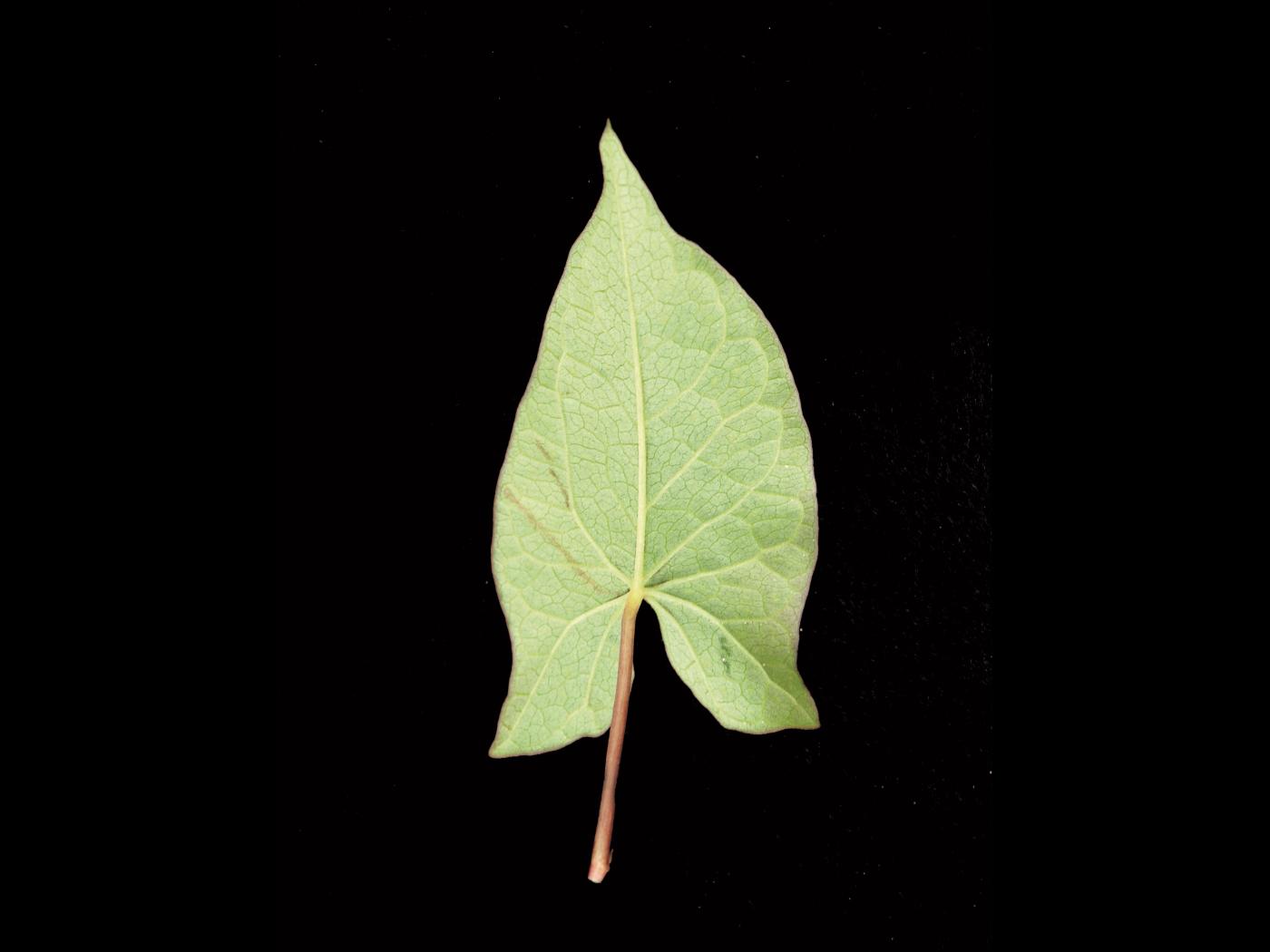 Les feuilles sont alternes sur la tige et sont portées par un long pétiole. Elles sont de forme ovale à triangulaire, hastées, à marge entière et mesurent de 5 à 10 cm de longueur. Les feuilles sont glabres.