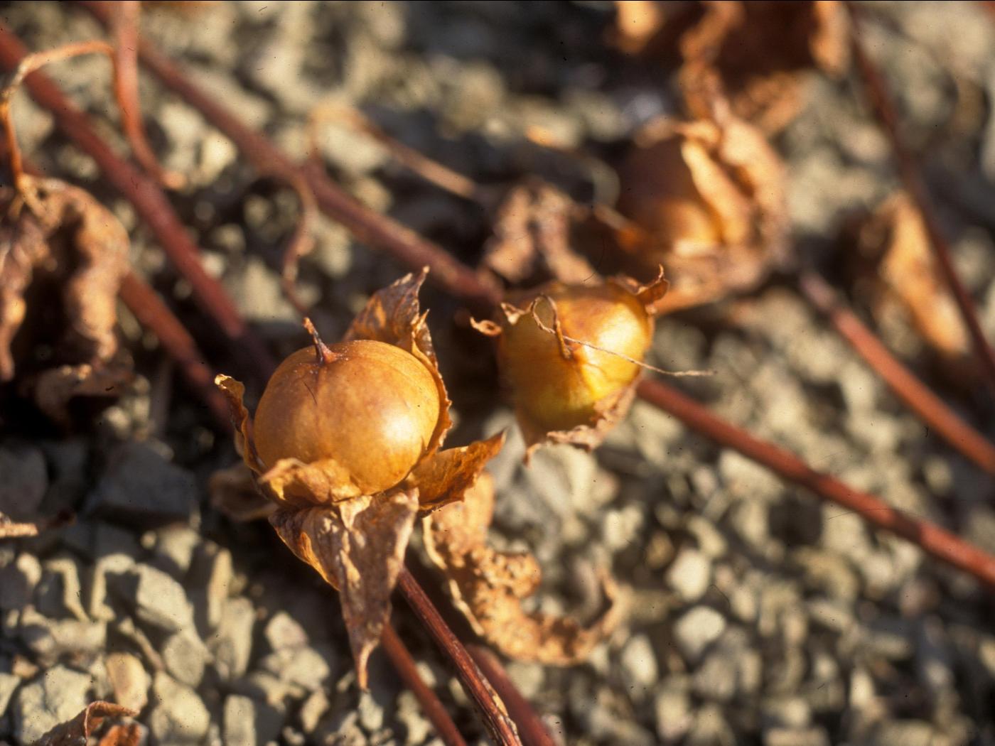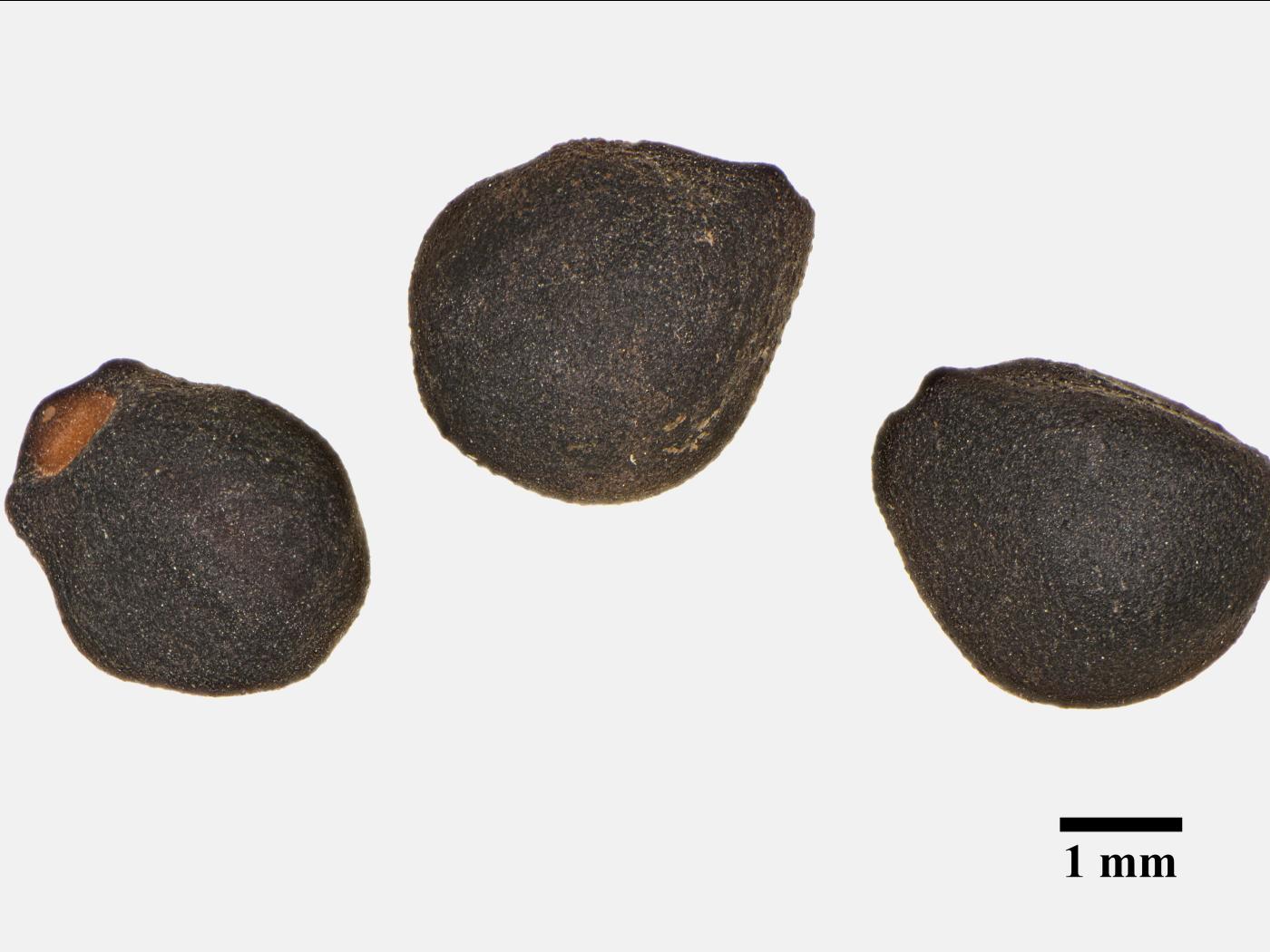 Les fruits sont des capsules arrondies à ovales qui mesurent 8 mm de diamètre. Les capsules contiennent de 2 à 4 graines qui mesurent de 4 à 5 mm de longueur. Ces dernières sont colorées de gris terne, de brun ou de noir. Elles ont un côté arrondi et deux côtés aplatis.