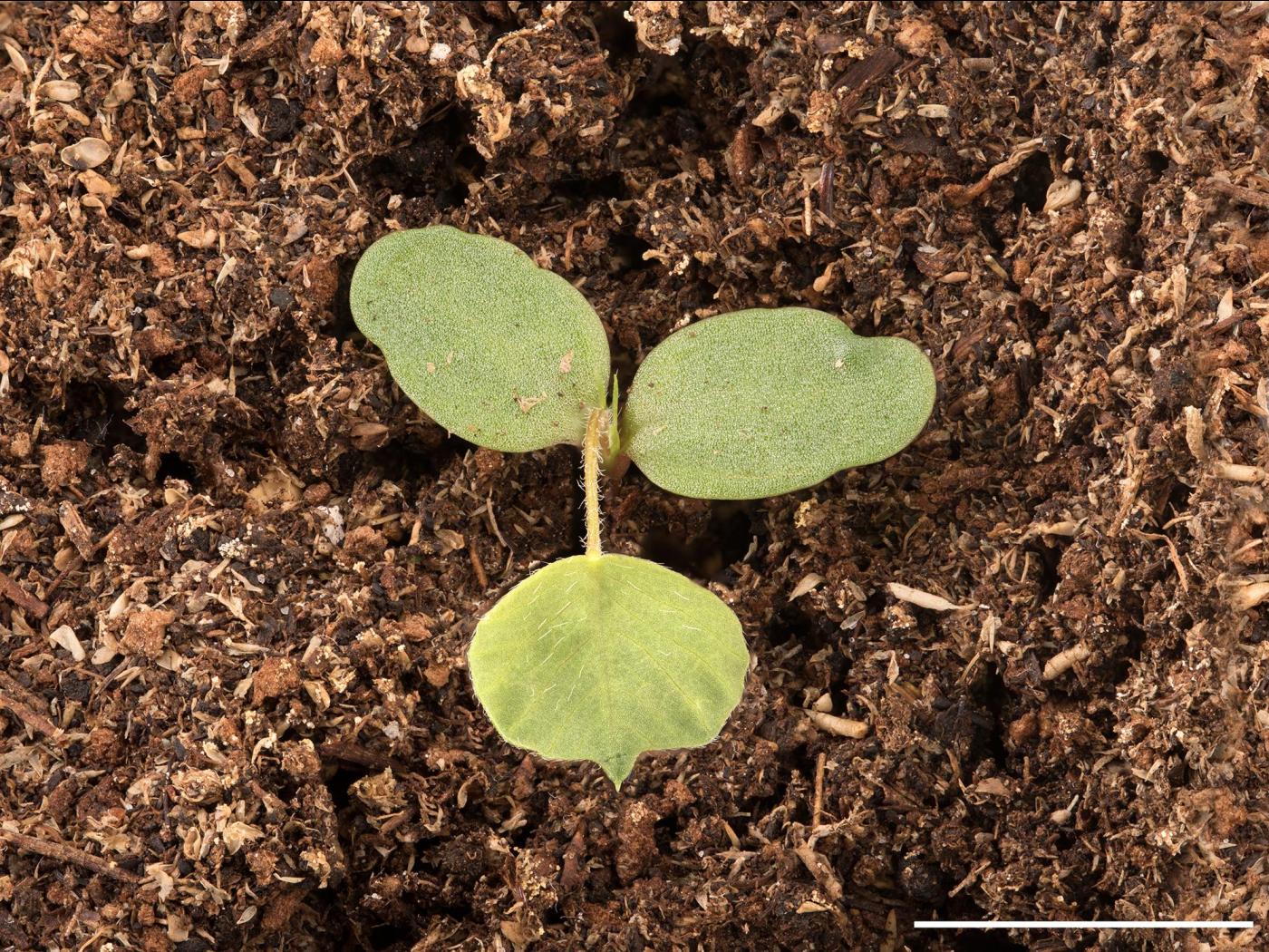 La plantule est à rosette et à feuilles alternes. Les cotylédons sont de forme oblongue et la première feuille est entière et de forme arrondie. Les feuilles suivantes sont comme les feuilles matures, soit composées de 3 folioles qui sont de forme obovée.