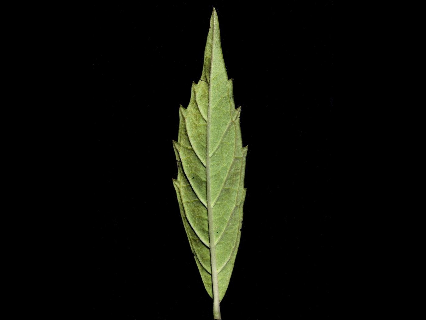 Les feuilles sont opposées sur la tige et portées par un pétiole court. Elles sont de forme lancéolée à elliptique et sont à marge faiblement dentée. Elles se terminent en pointe et mesure de 2 à 8 cm de longueur et de 0,6 à 3 cm de largeur. Elles sont glabres ou finement pubescentes.