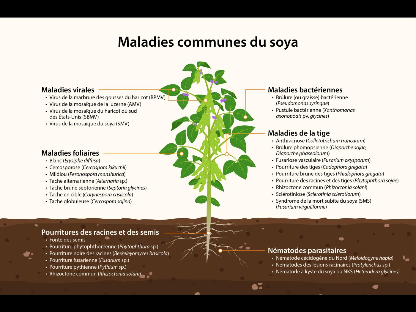 : Illustration des principales maladies qui affectent le soya au Québec.