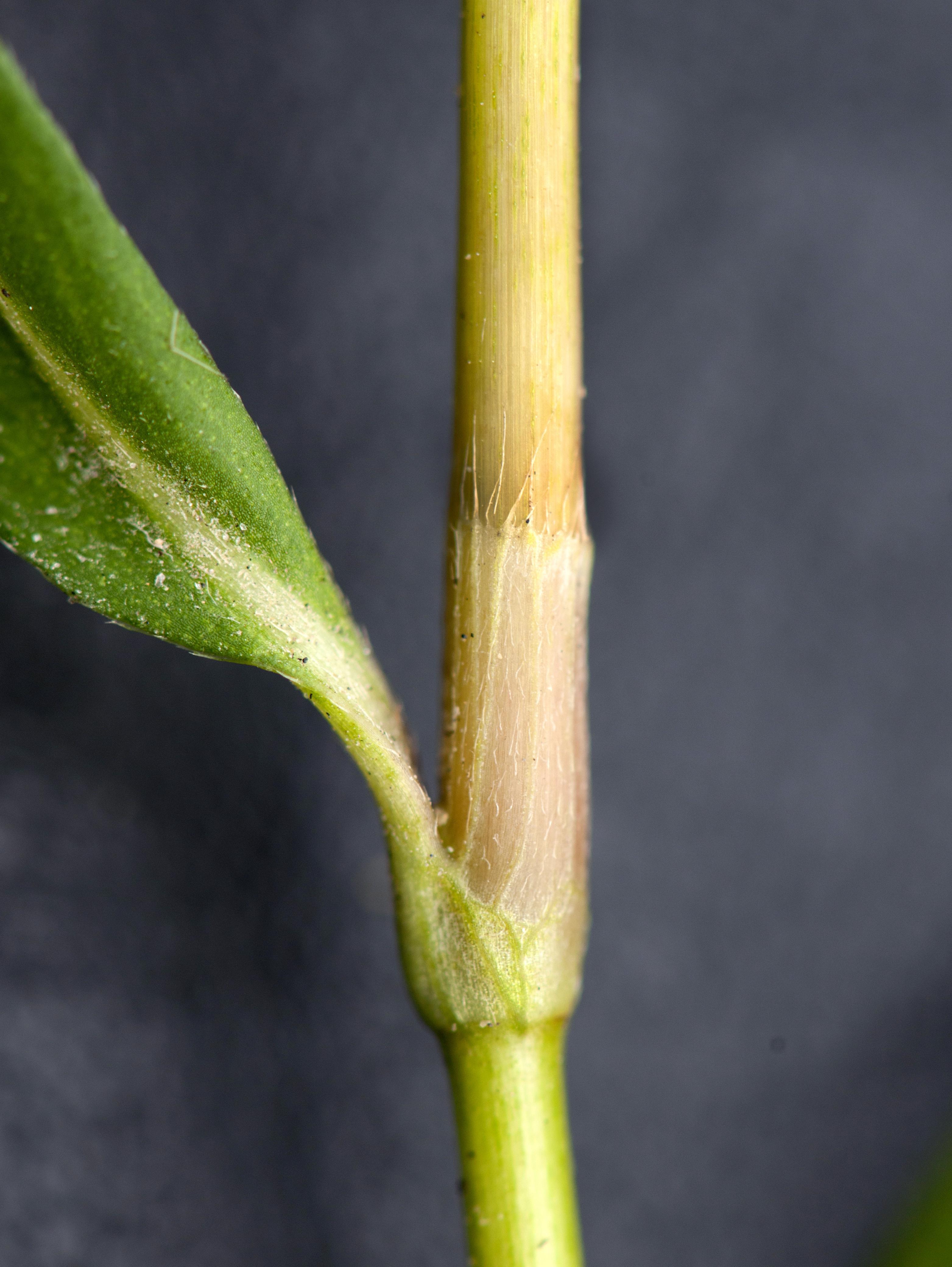 Les feuilles sont allongées et à marge entière. Elles mesurent de 5 à 10 cm de longueur et de 1,2 à 5 cm de largeur. Le limbe est glabre et souvent marqué d'une tache noirâtre de forme triangulaire au centre. Le pétiole est glabre ou parfois pubescent et mesure de 1 à 8 mm, les feuilles sont parfois sessiles. Un ochréa est présent à la base du pétiole et entoure la tige à chaque nœud. Il est pubescent et mesure de 4 à 10 mm de longueur. La marge est tronquée et ciliée au sommet.