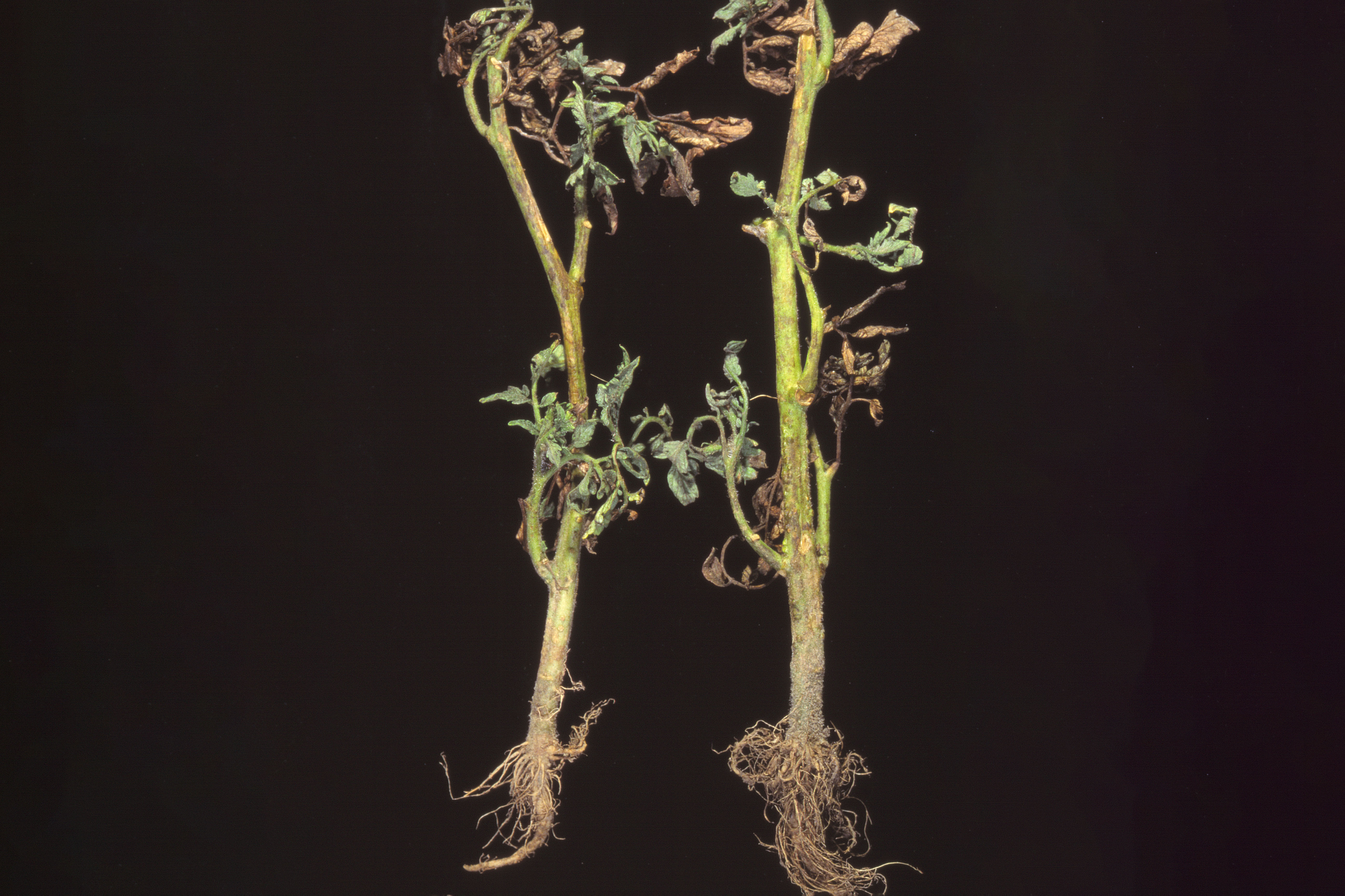Deux jeunes plants de tomate de serre montrent des brûlures entières de certaines feuilles tandis que d’autres demeurent vertes. Les feuilles s’enroulent vers le haut. Des primordia de racines adventives sont également visibles sur la tige (voir cercles). Le système vasculaire était fortement bruni (non visible ici). Les tests de laboratoire ont révélé la présence de la bactérie Ralstonia solanacearum, responsable du flétrissement bactérien des solanacées. Les plants provenaient de la Géorgie aux États-Unis.