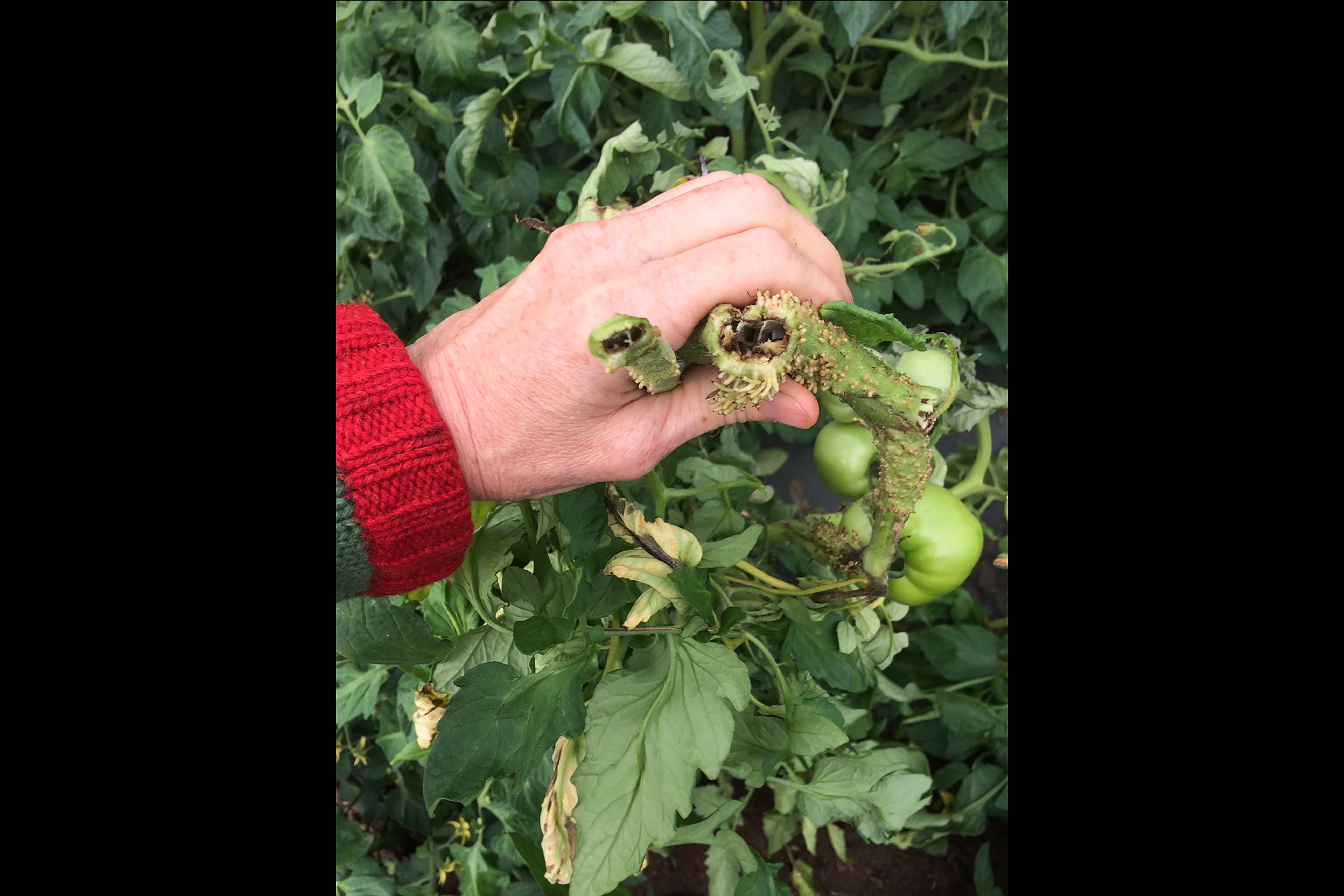 Une vue rapprochée des tiges de tomate de champ (cv 'Prima Red') montre un affaissement de la moelle vis-à-vis les racines adventives ou les chancres bruns à noirs observés sur les tiges. Les feuilles localisées dans les zones supérieures aux chancres sont jaunes et flétries (non visible ici). Les tests de laboratoire ont révélé la présence de la bactérie Pseudomonas corrugata, responsable de la moelle noire chez la tomate.