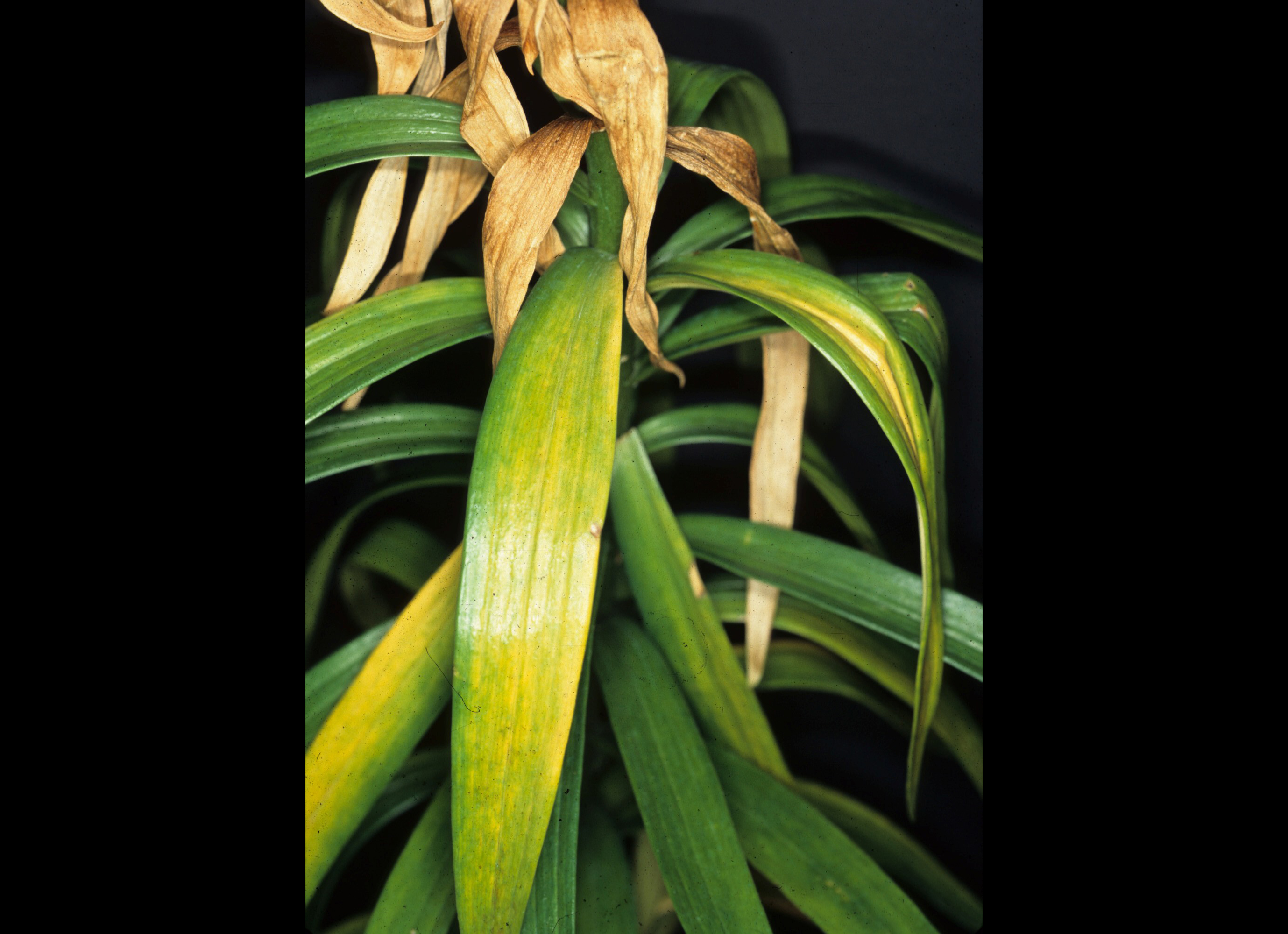 Ce lis de Pâques (cv 'Nellie White') présente un dépérissement complet des jeunes feuilles caractérisé par une coloration beige à brune couvrant tout le limbe suivi d’un dessèchement. Le point de croissance pouvant être affecté, le développement de certains plants est restreint, voire arrêté, d’où le nanisme. Les feuilles médianes et basales présentent des stries et taches jaunes localisées entre les nervures principales. Un enroulement peut également être noté sur certaines feuilles. Les observations microscopiques ont révélé la présence du nématode foliaire Aphelenchoides sp. Pour le lis de Pâques, il est reconnu que l’Aphelenchoides peut être présent sur les bourgeons dormants à l’intérieur des bulbes.