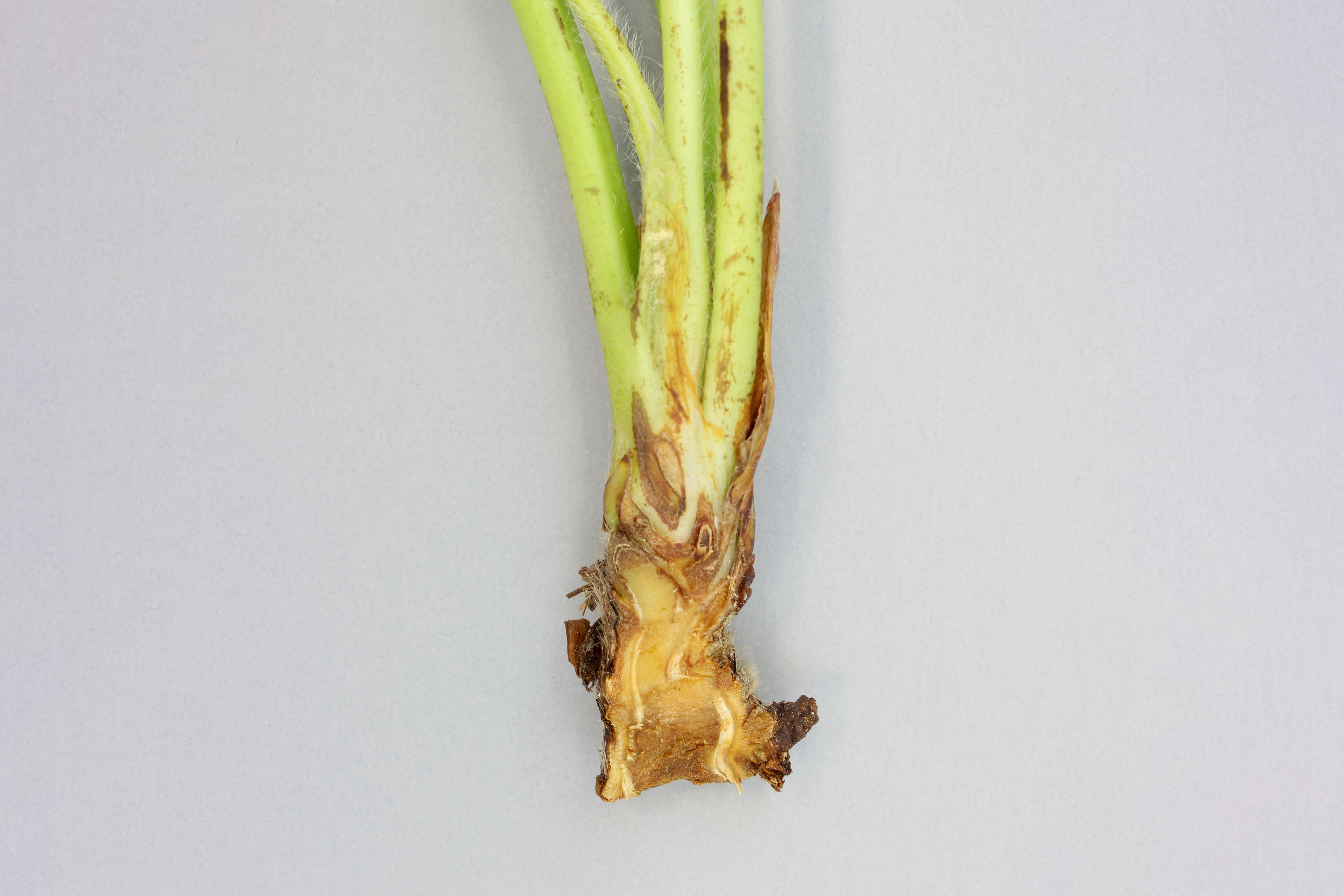 Le collet de ce fraisier (cv 'Monterey') montre une moelle brune dans sa partie basale. Le système vasculaire est sans symptôme tout comme le feuillage. Les tests de laboratoire se sont avérés négatifs pour la détection des champignons, particulièrement pour Phytophthora dans le collet et les racines. Il est plausible de croire que ce plant a subi du gel hivernal léger.