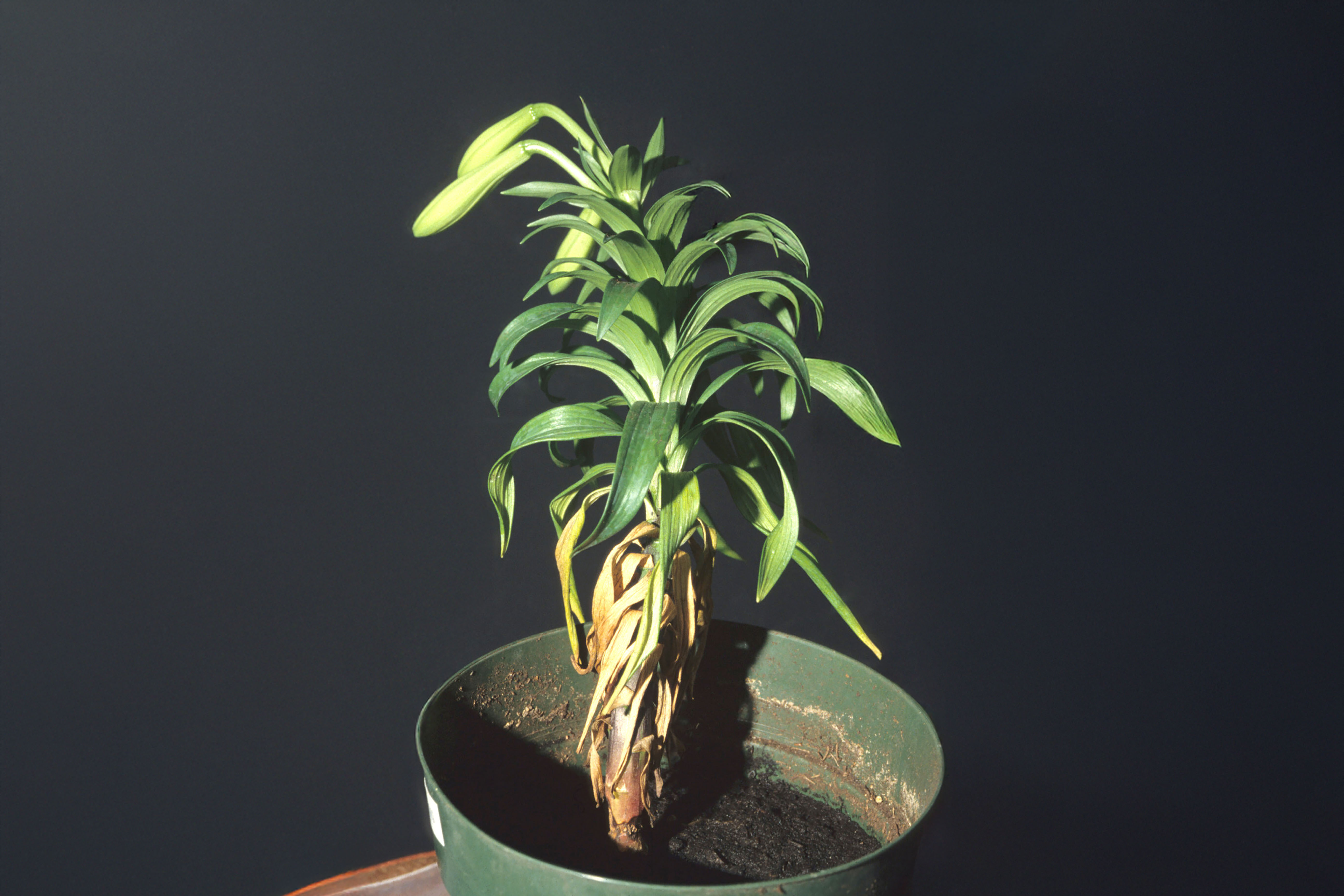 Sur un lis de Pâques cultivé en serre, les feuilles basales et médianes sont partiellement à complètement jaunies et brûlées. Les nouvelles feuilles sont sans symptôme. Les racines étaient pourries (non visible ici). L’analyse du substrat a révélé une conductivité électrique variant entre 6,2 et 7,0 mS/cm, ce qui représente plus du double de la valeur normale (2,0 à 3,5 mS/cm). Dans le cas présent, la conductivité électrique élevée indique un excès de salinité du terreau.