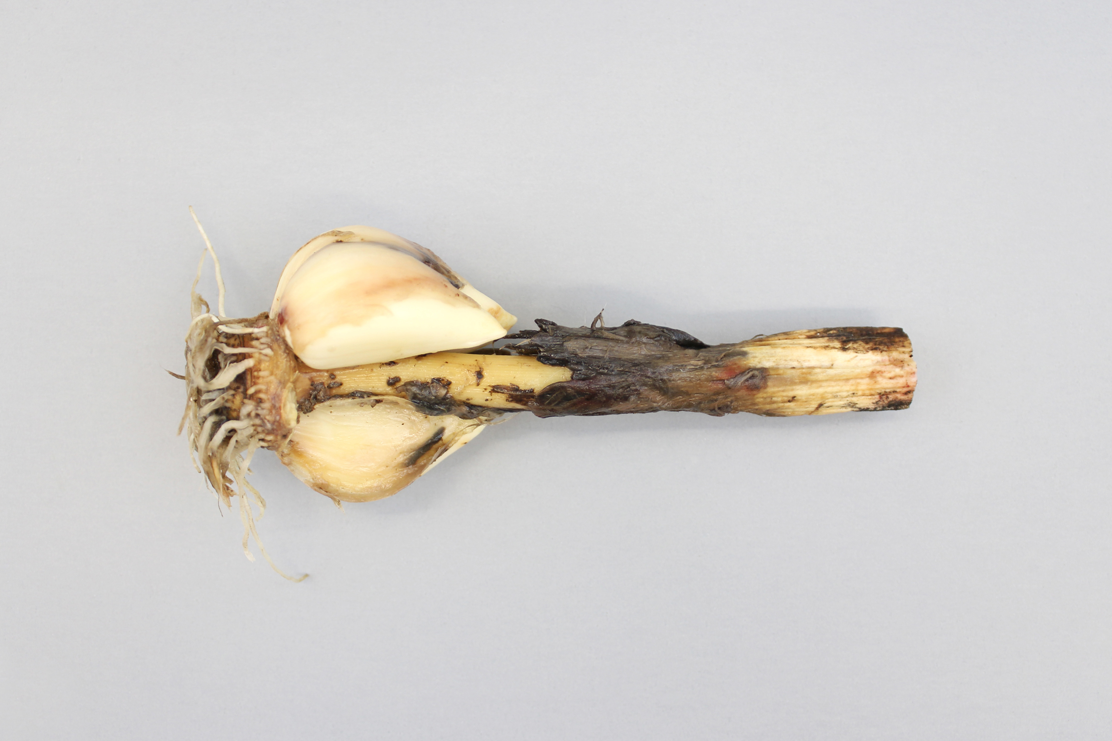 Sur ce bulbe d’ail provenant d‘un champ, les tuniques externes et les tissus du collet sont pourris et couverts d’une fine couche de fructifications noires poudreuses et des setae. Les tests de laboratoire ont révélé la présence du champignon Colletotrichum circinans, responsable de l’anthracnose chez les Allium. Les symptômes sont apparus lors de la maturation des gousses.