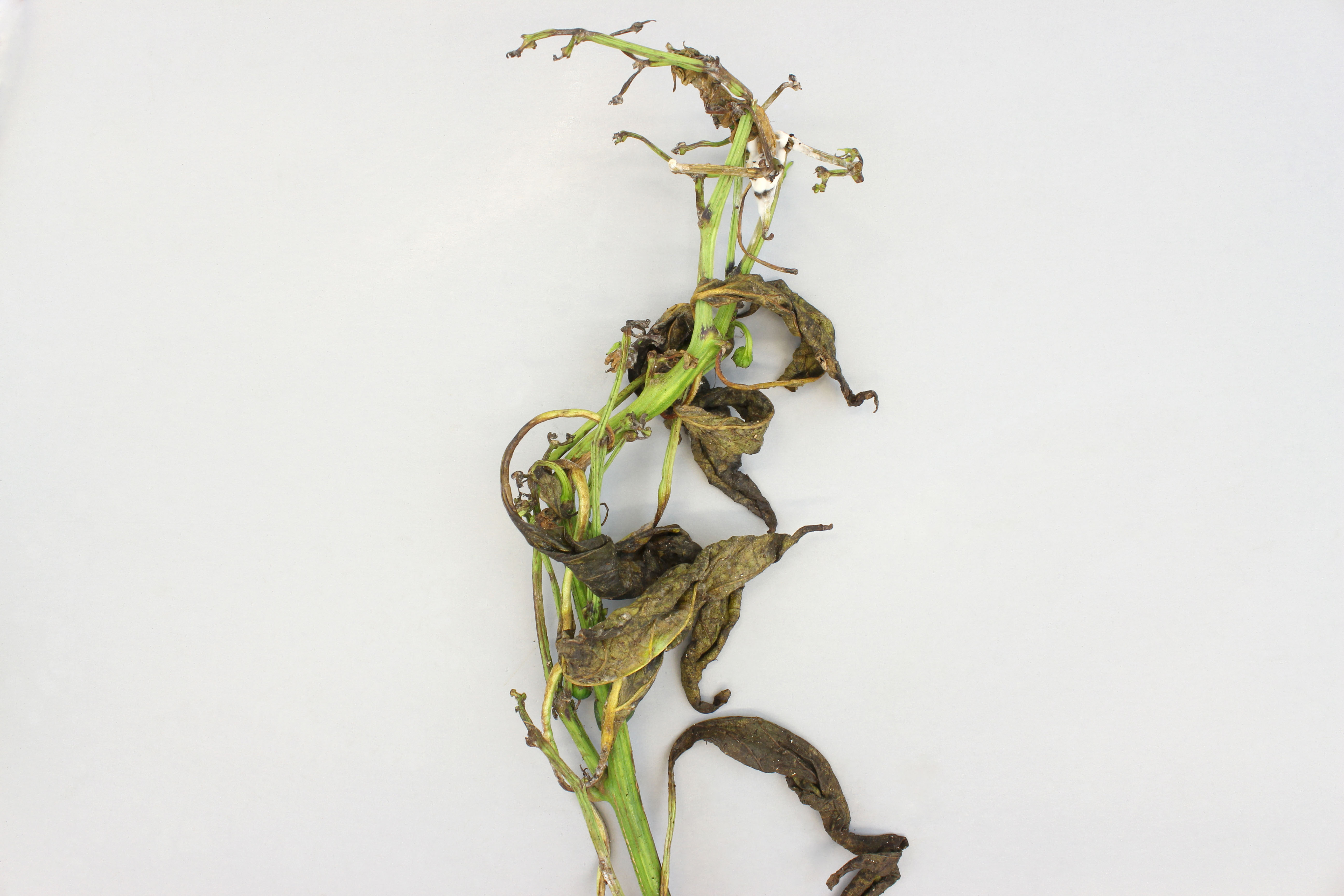 L’extrémité des tiges d’un plant de poivron de champ montre des zones de pourriture dans lesquelles les tissus sont bruns. Un mycélium blanc est présent dans les zones de pourriture. Le pétiole des feuilles est également affecté. Les feuilles sont complètement dépéries. Les tests de laboratoire ont révélé la présence du champignon Sclerotinia sclerotiorum, responsable de la pourriture sclérotique (sclérotiniose).