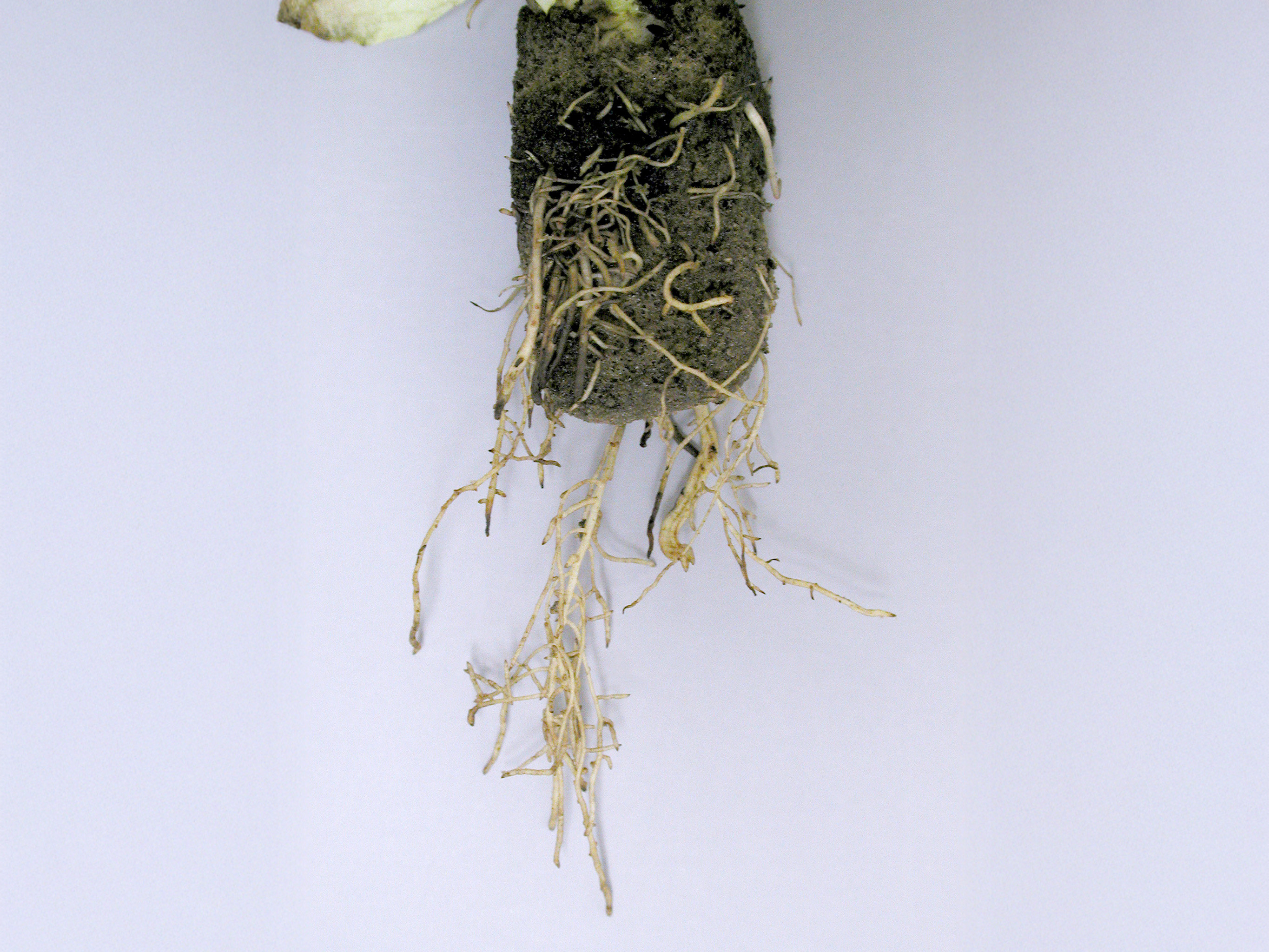 Le système racinaire d’un plant de laitue Boston cultivé en serre hydroponique présente des primordia racinaires bruns, un brunissement important de l’extrémité de certaines racines principales et un entortillement des radicelles. Les tests de laboratoire ont révélé la présence de Pythium dissotocum dans les racines.