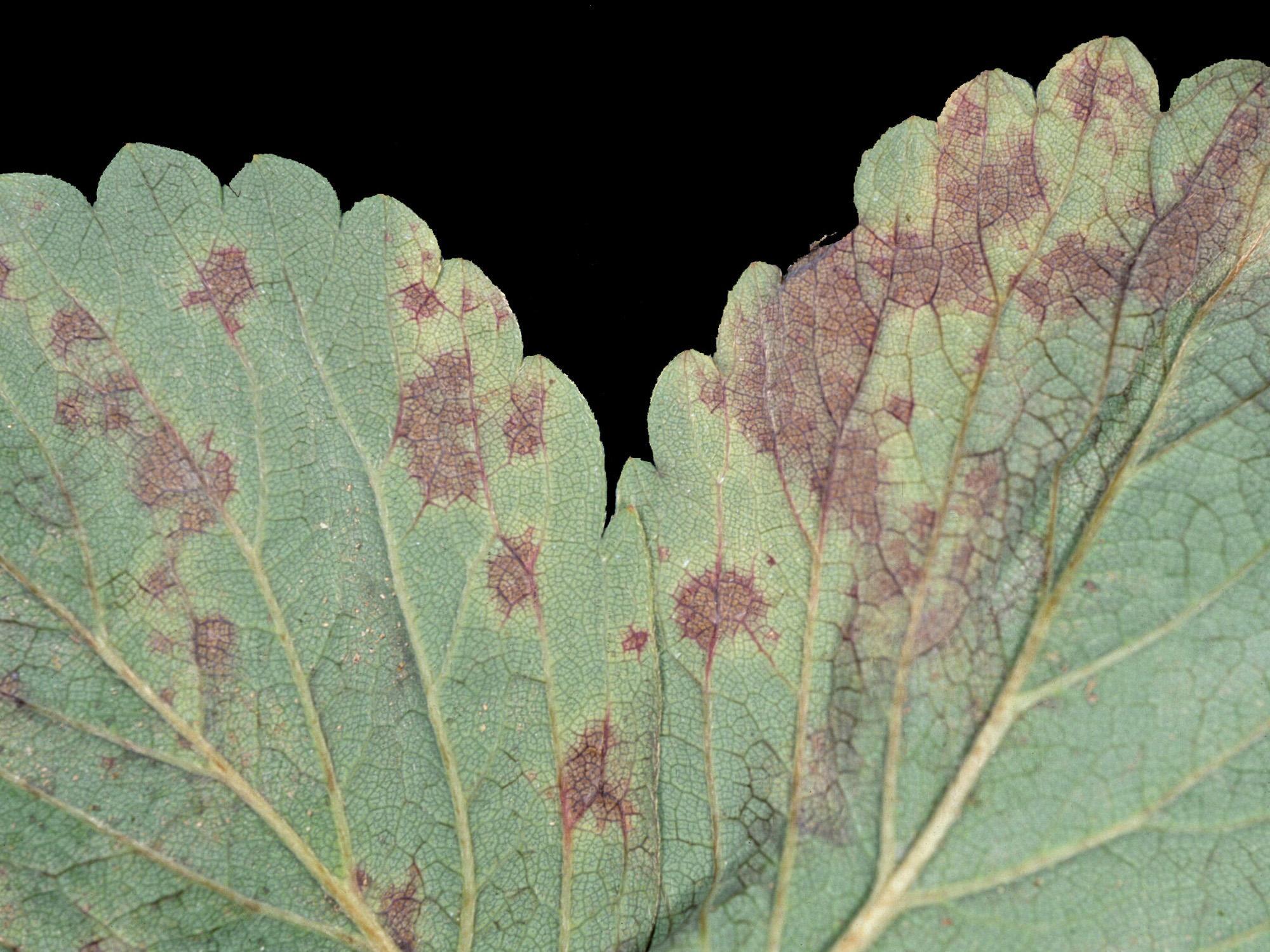 Chez le fraisier, le champignon hiverne sur le feuillage infecté sous la forme de cléistothèces ou dans les feuilles du cœur des plants sous la forme de mycélium. Au printemps, des ascospores ou des conidies sont produites et dispersées par le vent. Ces structures fongiques infectent le jeune feuillage et leur germination est influencée par la température et l’humidité relative. Elle sera maximale à 20 °C sous une humidité relative élevée (environ 100 %) mais le feuillage doit être sec car l’eau tue les conidies. Par la suite, l’humidité relative a peu d’impact sur le processus d’infection et de développement de la maladie, seule la température devient le facteur critique. La température optimale pour l’infection, la croissance du champignon et le développement de la maladie se situe entre 18 et 22,5 °C. Les jeunes feuilles infectées se couvrent de taches rouges et d’un duvet blanchâtre contenant les conidies du champignon. Ces conidies assurent les infections tout au long de la saison. Les symptômes foliaires apparaissent environ 6 jours après l’infection.