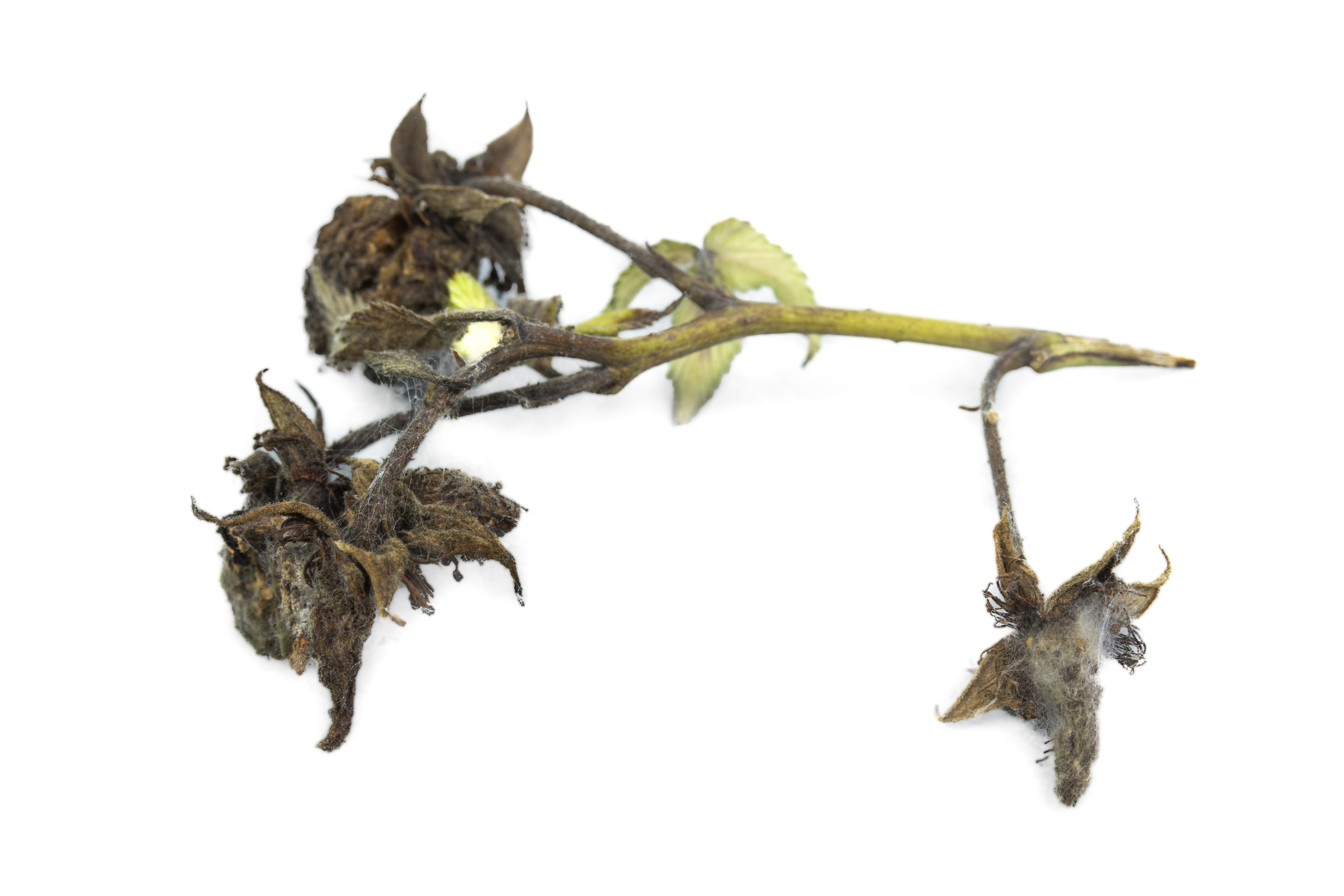 Sur cette grappe de framboisier (cv 'Patriot'), les fruits sont complètement brunis et momifiés. Les sépales et les pédicelles sont brunis et desséchés et l’on observe une sporulation noire sur les tissus. Un mycélium blanc a proliféré sur l’ensemble des tissus atteints.Les tests en laboratoire ont permis d’identifier la présence de Botrytis sp., responsable de la moisissure grise chez la framboise.