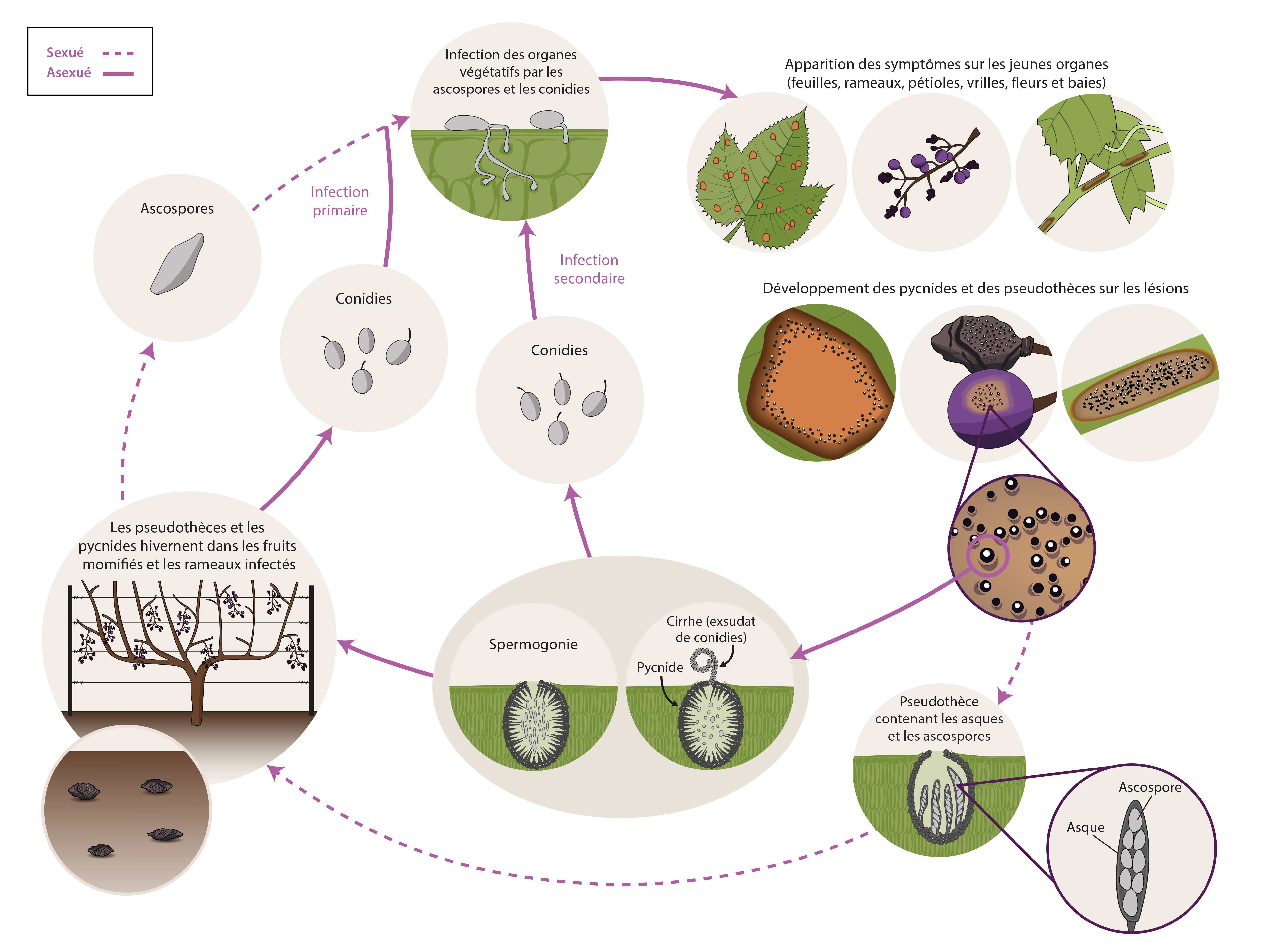 Vigne (raisin) - Pourriture noire (Phyllosticta ampelicida) - Cycle de maladie
